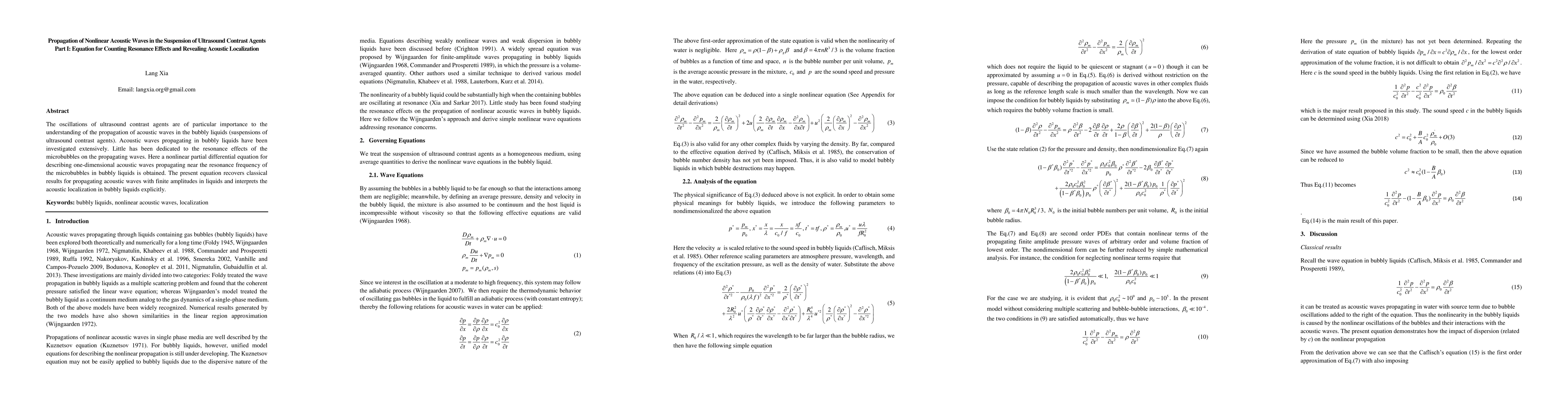 This paper develops a nonlinear partial differential equation to describe one-dimensional acoustic waves in bubbly liquids near the resonance frequency of microbubbles, revealing resonance effects and acoustic localization in such suspensions. The equation extends classical results and provides explicit interpretation of acoustic wave behavior in these media.