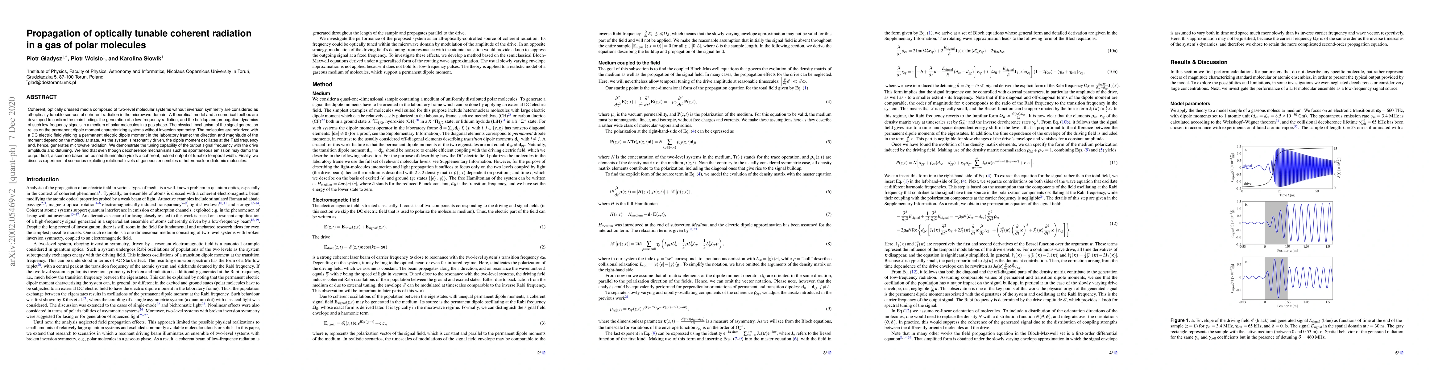 Coherent, optically dressed media composed of two-level molecular systems without inversion symmetry are considered as all-optically tunable sources of coherent radiation in the microwave domain. A theoretical model and a numerical toolbox are developed to confirm the main finding: the generation of a low-frequency radiation, and the buildup and propagation dynamics of such low-frequency signals in a medium of polar molecules in a gas phase. The physical mechanism of the signal generation relies on the permanent dipole moment characterizing systems without inversion symmetry. The molecules are polarized with a DC electric field yielding a permanent electric dipole moment in the laboratory frame; the direction and magnitude of the moment depend on the molecular state. As the system is resonantly driven, the dipole moment oscillates at the Rabi frequency and, hence, generates microwave radiation. We demonstrate the tuning capability of the output signal frequency with the drive amplitude and detuning. We find that even though decoherence mechanisms such as spontaneous emission may damp the output field, a scenario based on pulsed illumination yields a coherent, pulsed output of tunable temporal width. Finally, we discuss experimental scenarios exploiting rotational levels of gaseous ensembles of heteronuclear diatomic molecules.