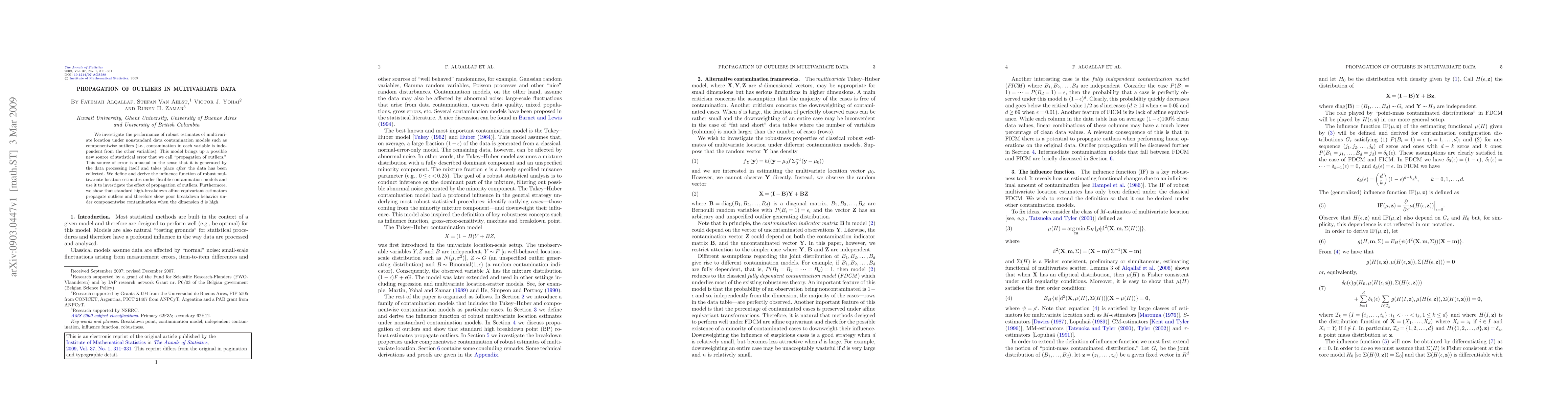 Researchers investigate how data contamination models like componentwise outliers affect robust estimates of multivariate location, finding that high-dimensional datasets are particularly prone to 'propagation of outliers'.