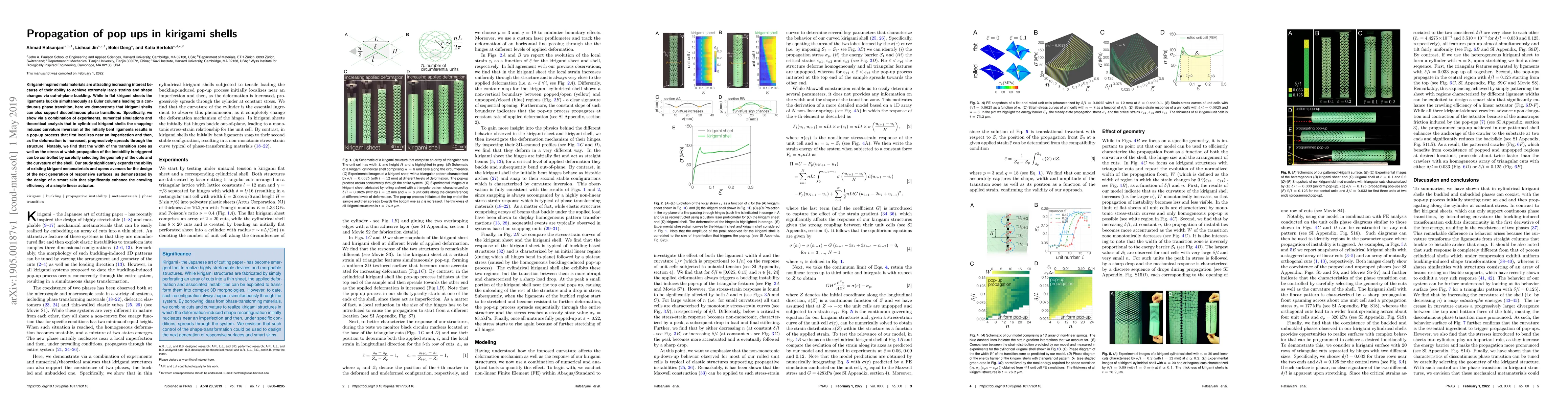 This paper investigates the propagation of pop-up mechanisms in kirigami shells, demonstrating that snapping-induced curvature inversion can lead to localized and then widespread deformation. The study reveals that the transition zone's width and triggering stress can be controlled by adjusting the shell's geometry and cut design, paving the way for advanced responsive surfaces.