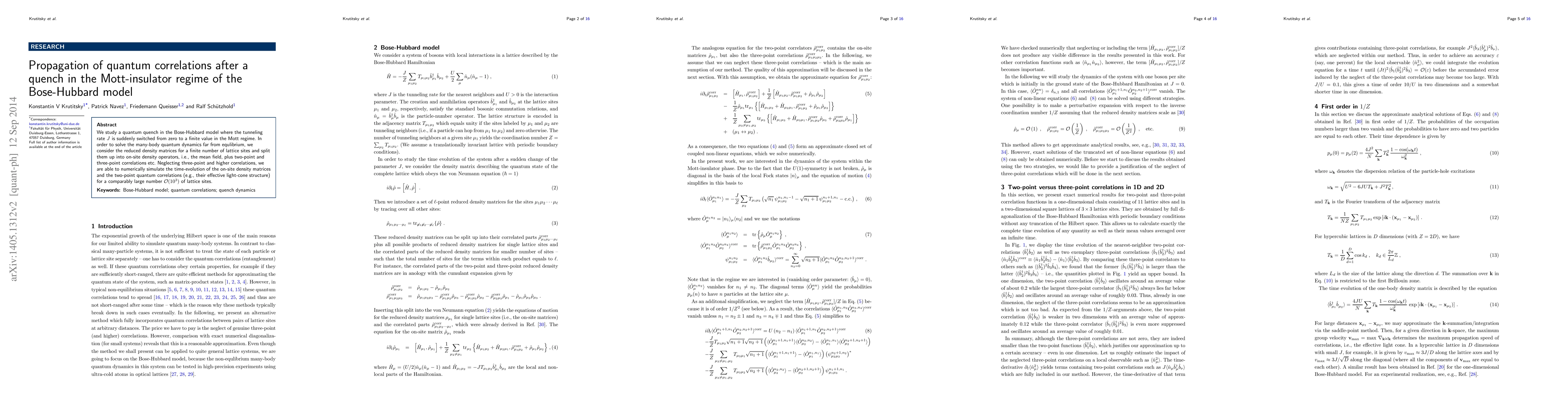 This paper investigates the propagation of quantum correlations after a sudden increase in tunneling rate in the Mott-insulator regime of the Bose-Hubbard model. The authors numerically simulate the time-evolution of reduced density matrices for a large number of lattice sites, focusing on two-point correlations to reveal their effective light-cone structure.