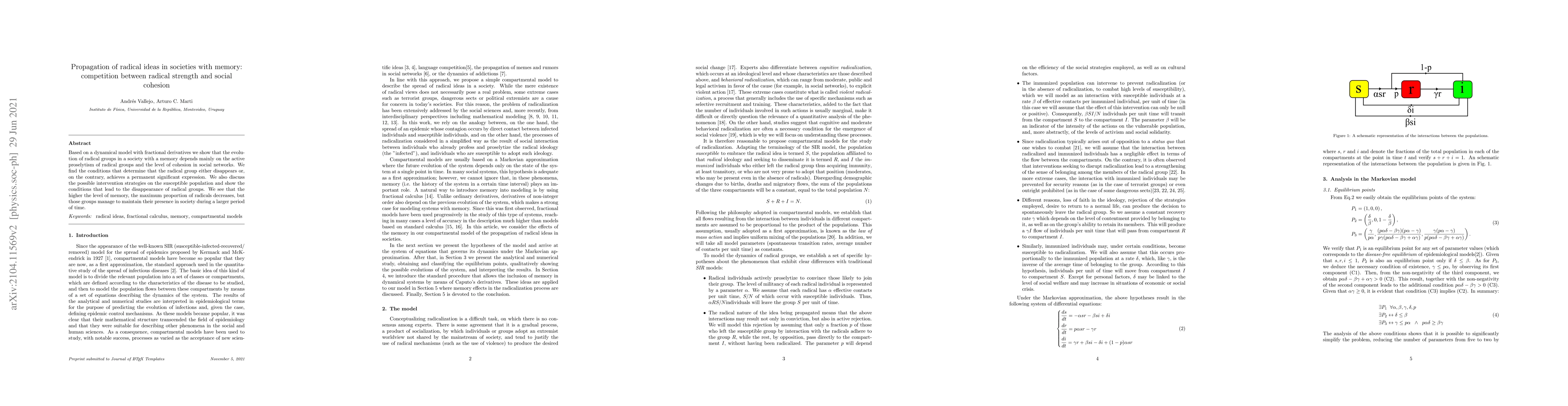 A study using a dynamical model with fractional derivatives found that radical groups in societies with memory disappear if their proselytism is not strong enough to overcome social cohesion, while they persist if the cohesion level is low.