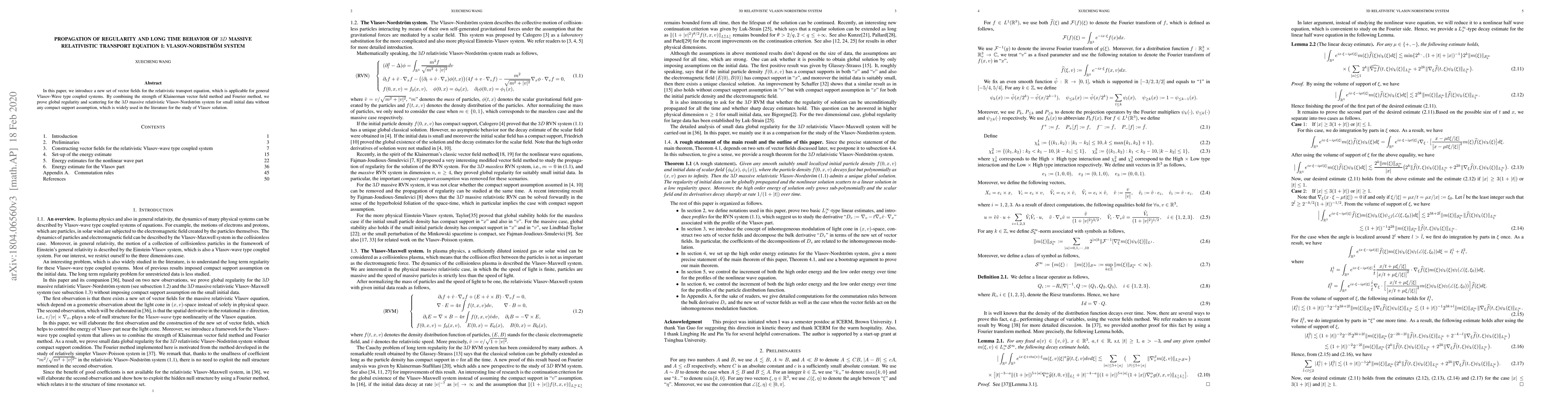 In this paper, we introduce a new set of vector fields for the relativistic transport equation, which is applicable for general Vlasov-Wave type coupled systems. By combining the strength of Klainerman vector field method and Fourier method, we prove global regularity and scattering for the $3D$ massive relativistic Vlasov-Nordstr\"om system for small initial data without any compact support assumption, which is widely used in the literature for the study of Vlasov solution.