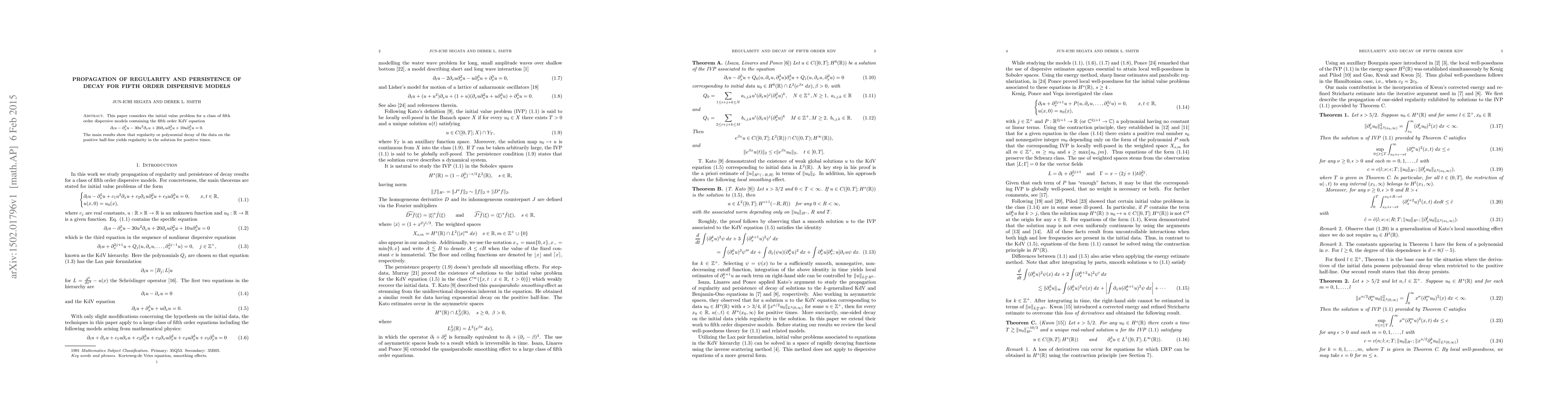 This paper considers the initial value problem for a class of fifth order dispersive models containing the fifth order KdV equation $$\partial_tu - \partial_x^5u - 30u^2\partial_xu + 20\partial_xu\partial_x^2u + 10u\partial_x^3u = 0.$$ The main results show that regularity or polynomial decay of the data on the positive half-line yields regularity in the solution for positive times.