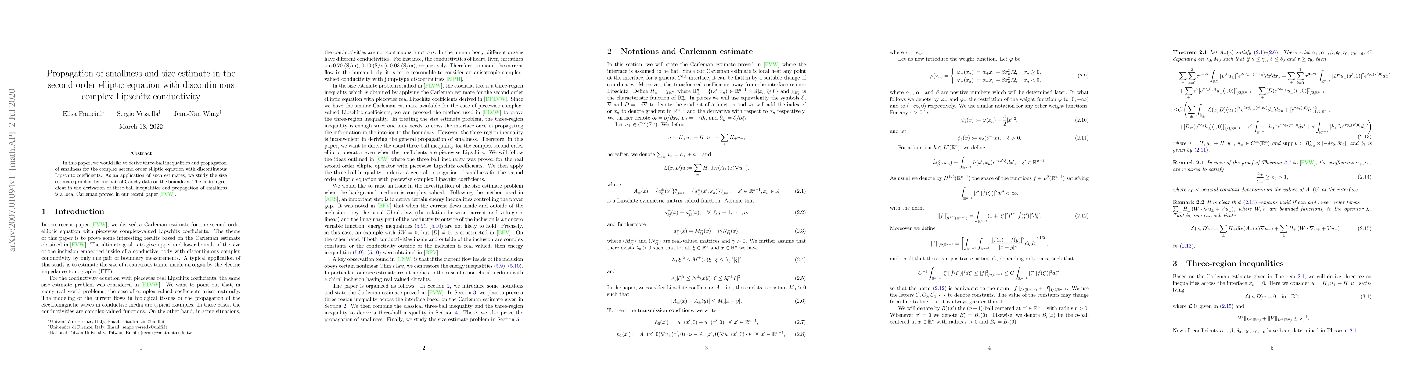 In this paper, we would like to derive three-ball inequalities and propagation of smallness for the complex second order elliptic equation with discontinuous Lipschitz coefficients. As an application of such estimates, we study the size estimate problem by one pair of Cauchy data on the boundary. The main ingredient in the derivation of three-ball inequalities and propagation of smallness is a local Carleman proved in our recent paper [FVW].