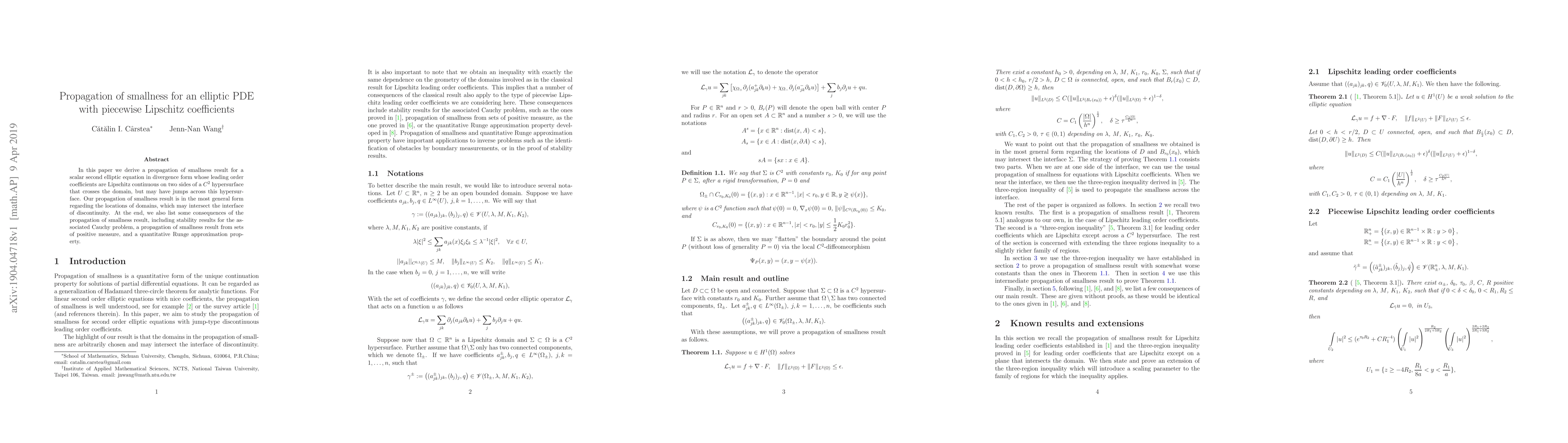 This paper derives a propagation of smallness result for a scalar second-order elliptic equation with piecewise Lipschitz coefficients, which can intersect and interact in various ways. The findings have implications for stability results, Cauchy problem solutions, and Runge approximation properties.