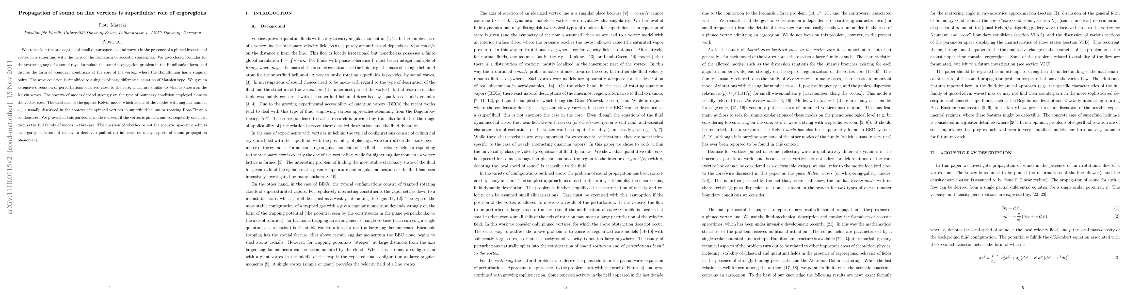 This paper explores sound wave propagation in superfluids with pinned vortices, using acoustic spacetime formalism. It reveals that pinned vortices eliminate the gapless Kelvin mode, and discusses the influence of ergoregions on sound propagation phenomena.