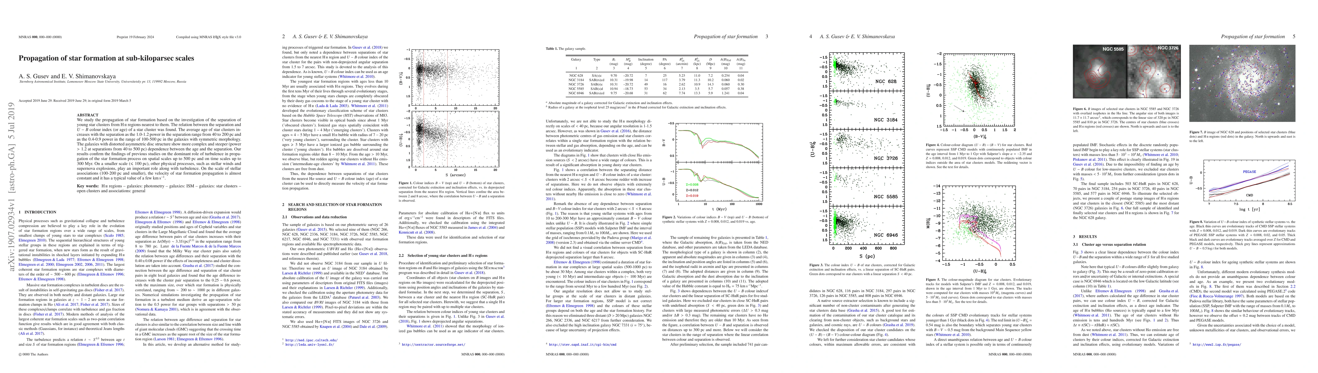 We study the propagation of star formation based on the investigation of the separation of young star clusters from HII regions nearest to them. The relation between the separation and U-B colour index (or age) of a star cluster was found. The average age of star clusters increases with the separation as the 1.0-1.2 power in the separation range from 40 to 200 pc and as the 0.4-0.9 power in the range of 100-500 pc in the galaxies with symmetric morphology. The galaxies with distorted asymmetric disc structure show more complex and steeper (power >1.2 at separations from 40 to 500 pc) dependence between the age and the separation. Our results confirm the findings of previous studies on the dominant role of turbulence in propagation of the star formation process on spatial scales up to 500 pc and on time scales up to 300 Myr. On a smaller scale (=<100 pc), other physical processes, such as stellar winds and supernova explosions, play an important role along with turbulence. On the scale of stellar associations (100-200 pc and smaller), the velocity of star formation propagation is almost constant and it has a typical value of a few km/s.