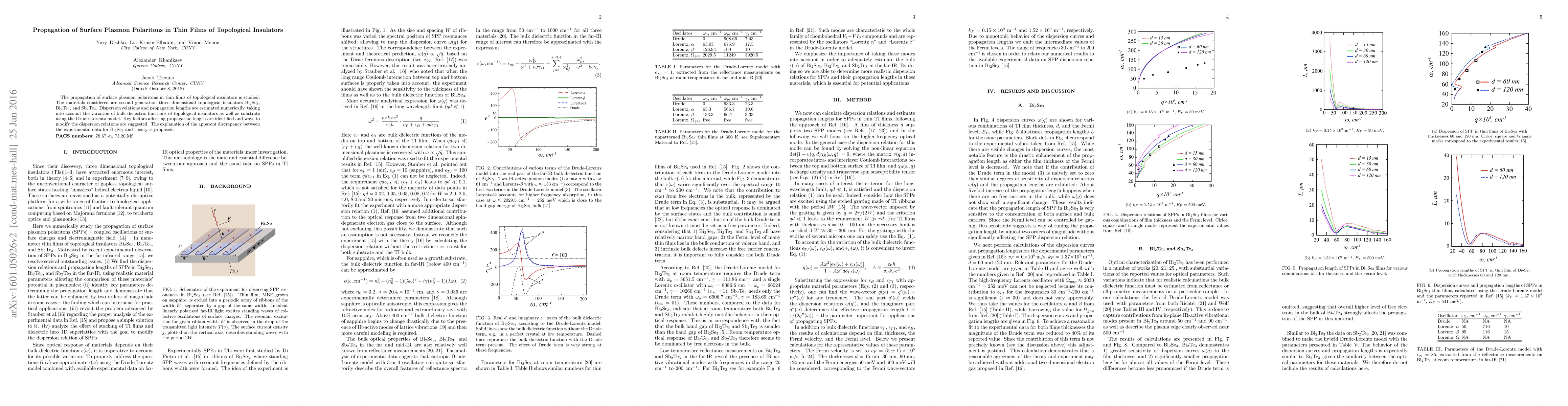 This paper investigates the propagation of surface plasmon polaritons in thin films of second-generation 3D topological insulators, specifically Bi$_2$Se$_3$, Bi$_2$Te$_3$, and Sb$_2$Te$_3$. Numerical estimates of dispersion relations and propagation lengths are provided, highlighting factors affecting propagation length and suggesting methods to modify dispersion relations.
