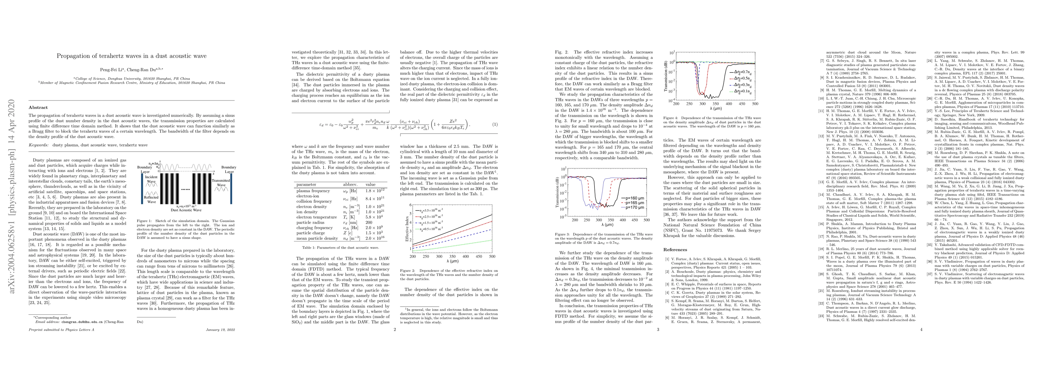 This study numerically investigates how terahertz waves propagate in dust acoustic waves, revealing that these waves can act as a Bragg filter, blocking specific terahertz wavelengths, with filter bandwidth influenced by the dust density profile.