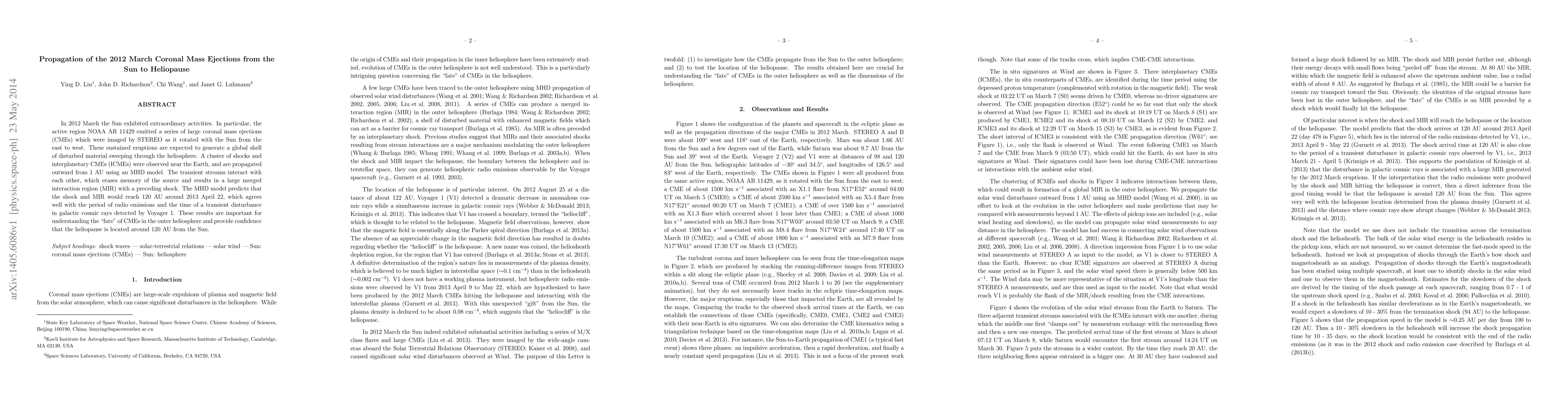 This paper investigates the propagation of large coronal mass ejections (CMEs) from the Sun in March 2012, modeled using an MHD model, which predicts their interaction and formation of a merged interaction region (MIR) reaching 120 AU, correlating with observed radio emissions and galactic cosmic ray disturbances detected by Voyager 1. The findings suggest the heliopause is located around 120 AU.