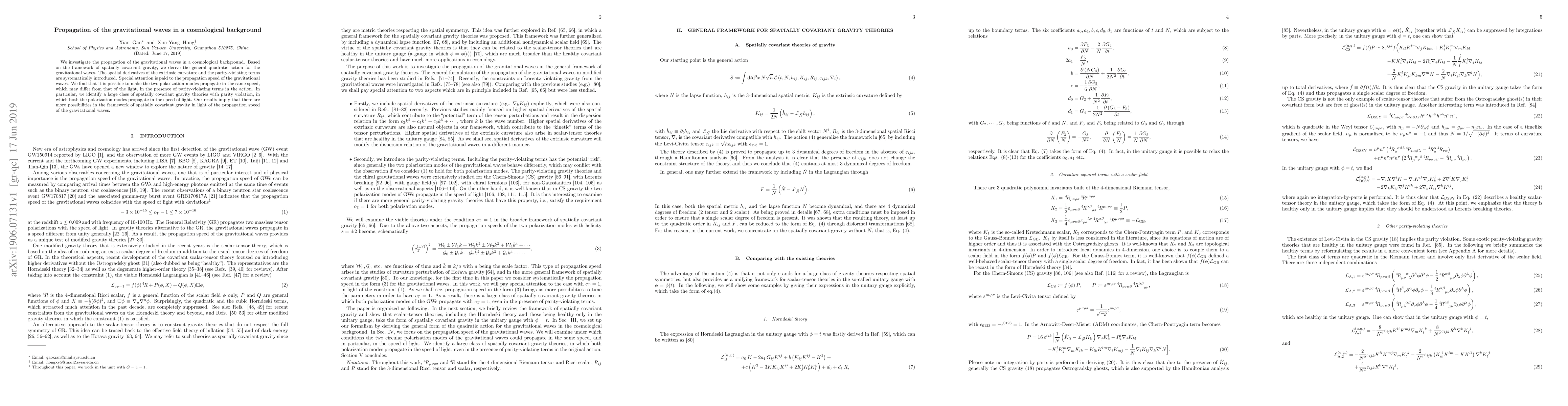 The paper presents a detailed derivation of the quadratic action for gravitational waves in spatially covariant gravity, including spatial derivatives of the extrinsic curvature and parity-violating terms, and analyzes the propagation speed of gravitational waves in this context.