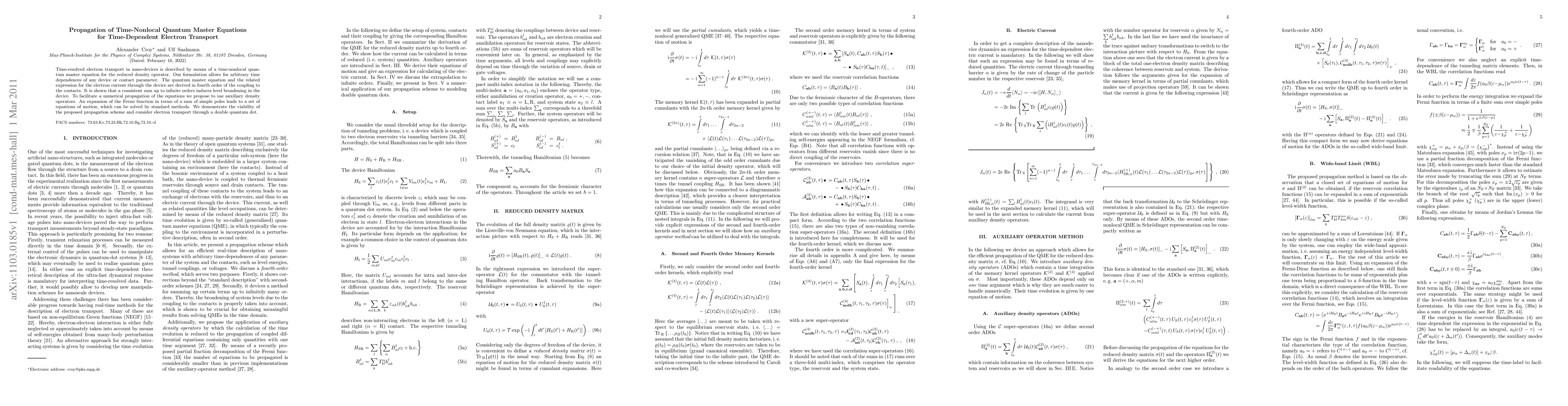Time-resolved electron transport in nano-devices is described by means of a time-nonlocal quantum master equation for the reduced density operator. Our formulation allows for arbitrary time dependences of any device or contact parameter. The quantum master equation and the related expression for the electron current through the device are derived in fourth order of the coupling to the contacts. It is shown that a consistent sum up to infinite orders induces level broadening in the device. To facilitate a numerical propagation of the equations we propose to use auxiliary density operators. An expansion of the Fermi function in terms of a sum of simple poles leads to a set of equations of motion, which can be solved by standard methods. We demonstrate the viability of the proposed propagation scheme and consider electron transport through a double quantum dot.