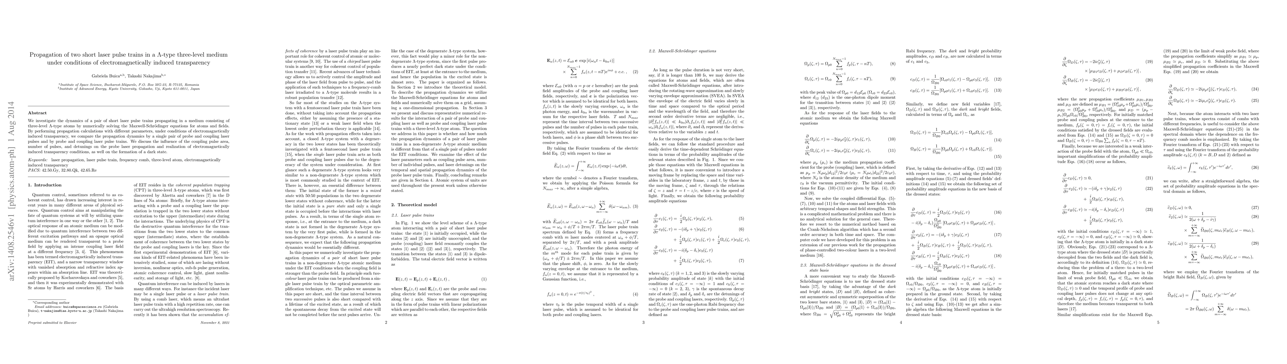 We investigate the dynamics of a pair of short laser pulse trains propagating in a medium consisting of three-level $\Lambda$-type atoms by numerically solving the Maxwell-Schr\"odinger equations for atoms and fields. By performing propagation calculations with different parameters, under conditions of electromagnetically induced transparency, we compare the propagation dynamics by a single pair of probe and coupling laser pulses and by probe and coupling laser pulse trains. We discuss the influence of the coupling pulse area, number of pulses, and detunings on the probe laser propagation and realization of electromagnetically induced transparency conditions, as well on the formation of a dark state.
