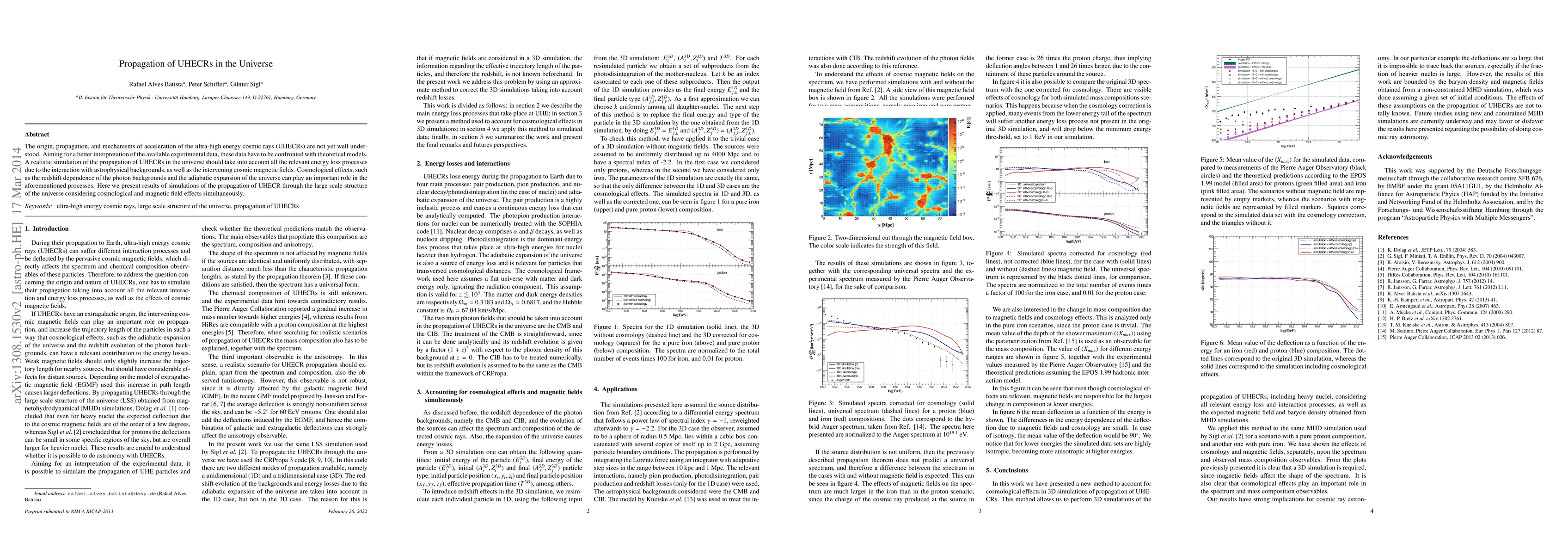 The origin, propagation, and mechanisms of acceleration of the ultra-high energy cosmic rays (UHECRs) are not yet well understood. Aiming for a better interpretation of the available experimental data, these data have to be confronted with theoretical models. A realistic simulation of the propagation of UHECRs in the universe should take into account all the relevant energy loss processes due to the interaction with astrophysical backgrounds, as well as the intervening cosmic magnetic fields. Cosmological effects, such as the redshift dependence of the photon backgrounds and the adiabatic expansion of the universe can play an important role in the aforementioned processes. Here we present results of simulations of the propagation of UHECR through the large scale structure of the universe considering cosmological and magnetic field effects simultaneously.