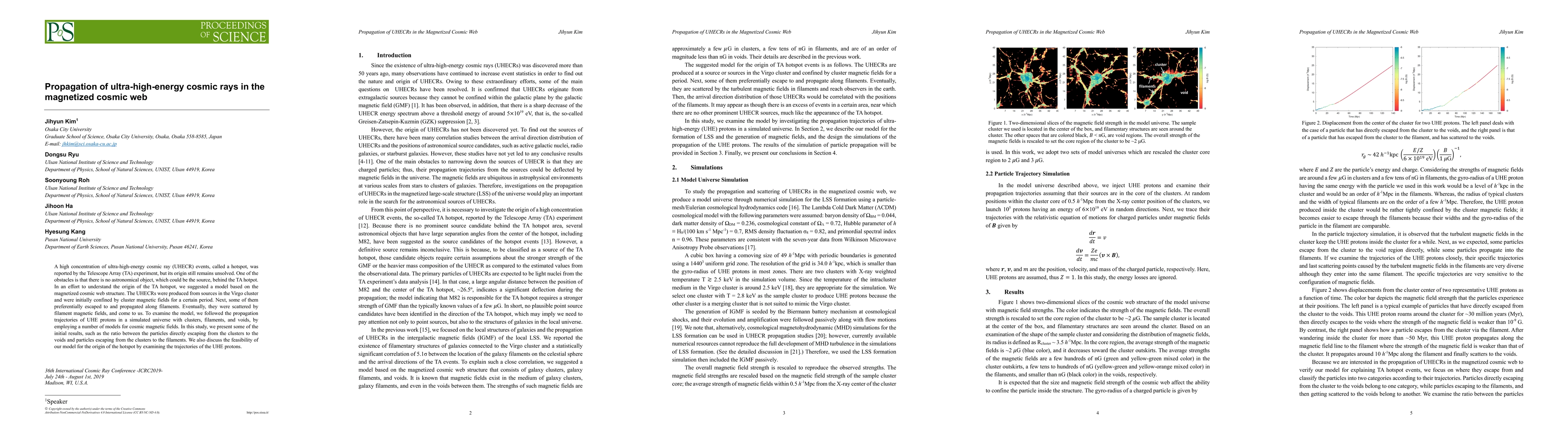 A high concentration of ultra-high-energy cosmic ray (UHECR) events, called a hotspot, was reported by the Telescope Array (TA) experiment, but its origin still remains unsolved. One of the obstacles is that there is no astronomical object, which could be the source, behind the TA hotpot. In an effort to understand the origin of the TA hotspot, we suggested a model based on the magnetized cosmic web structure. The UHECRs were produced from sources in the Virgo cluster and were initially confined by cluster magnetic fields for a certain period. Next, some of them preferentially escaped to and propagated along filaments. Eventually, they were scattered by filament magnetic fields, and come to us. To examine the model, we followed the propagation trajectories of UHE protons in a simulated universe with clusters, filaments, and voids, by employing a number of models for cosmic magnetic fields. In this study, we present some of the initial results, such as the ratio between the particles directly escaping from the clusters to the voids and particles escaping from the clusters to the filaments. We also discuss the feasibility of our model for the origin of the hotspot by examining the trajectories of the UHE protons.