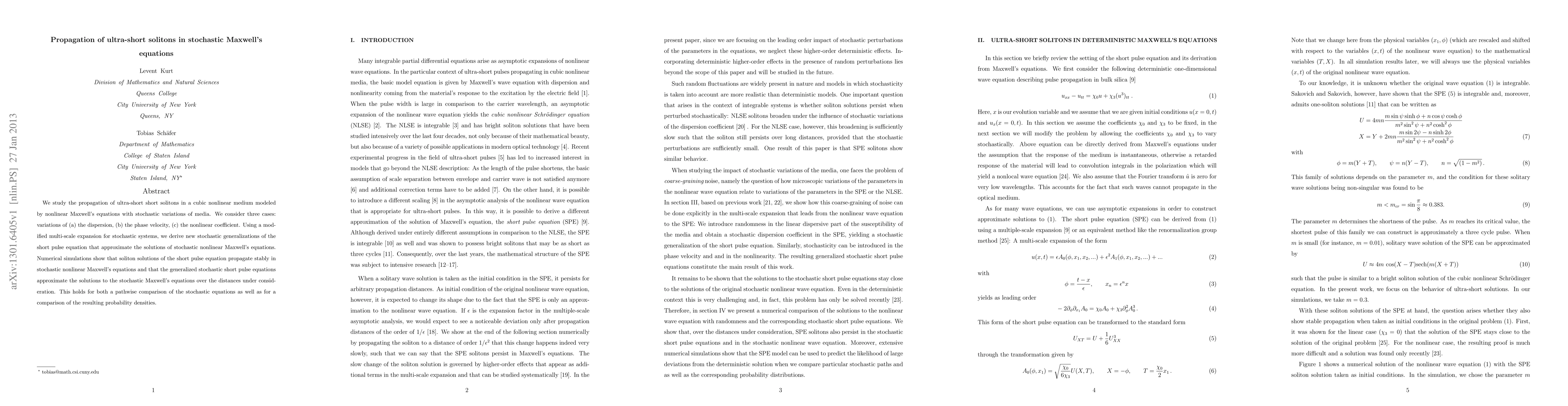 This paper investigates the behavior of ultra-short solitons in stochastic nonlinear Maxwell's equations, considering variations in dispersion, phase velocity, and nonlinear coefficient. It derives new stochastic generalizations of the short pulse equation and demonstrates through numerical simulations that these approximations maintain stable soliton propagation.