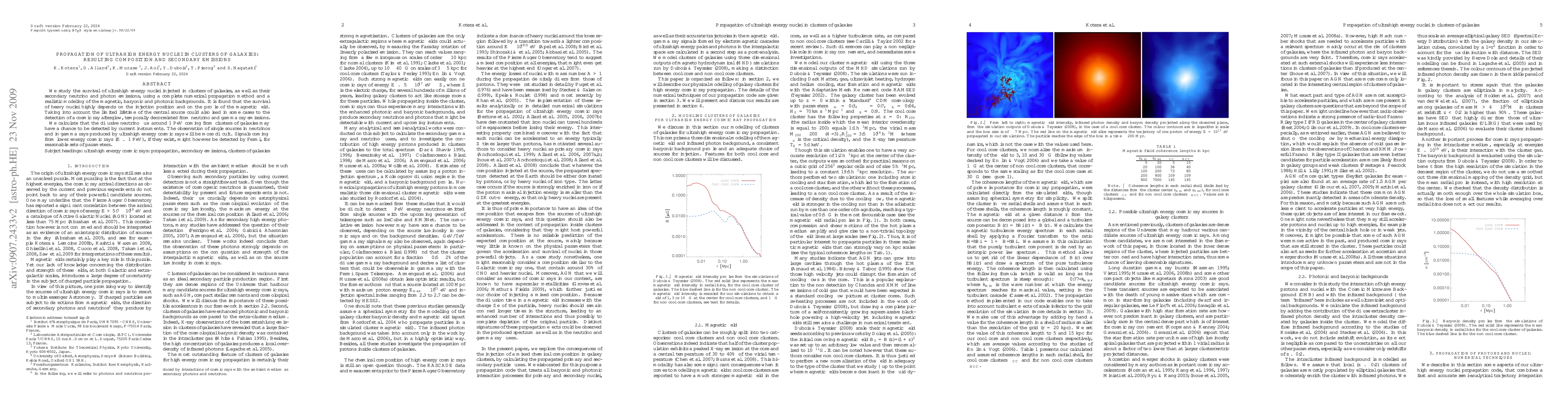 We study the survival of ultrahigh energy nuclei injected in clusters of galaxies, as well as their secondary neutrino and photon emissions, using a complete numerical propagation method and a realistic modeling of the magnetic, baryonic and photonic backgrounds. It is found that the survival of heavy nuclei highly depends on the injection position and on the profile of the magnetic field. Taking into account the limited lifetime of the central source could also lead in some cases to the detection of a cosmic ray afterglow, temporally decorrelated from neutrino and gamma ray emissions. We calculate that the diffusive neutrino flux around 1 PeV coming from clusters of galaxies may have a chance to be detected by current instruments. The observation of single sources in neutrinos and in gamma rays produced by ultrahigh energy cosmic rays will be more difficult. Signals coming from lower energy cosmic rays (E < 1 PeV), if they exist, might however be detected by Fermi, for reasonable sets of parameters.