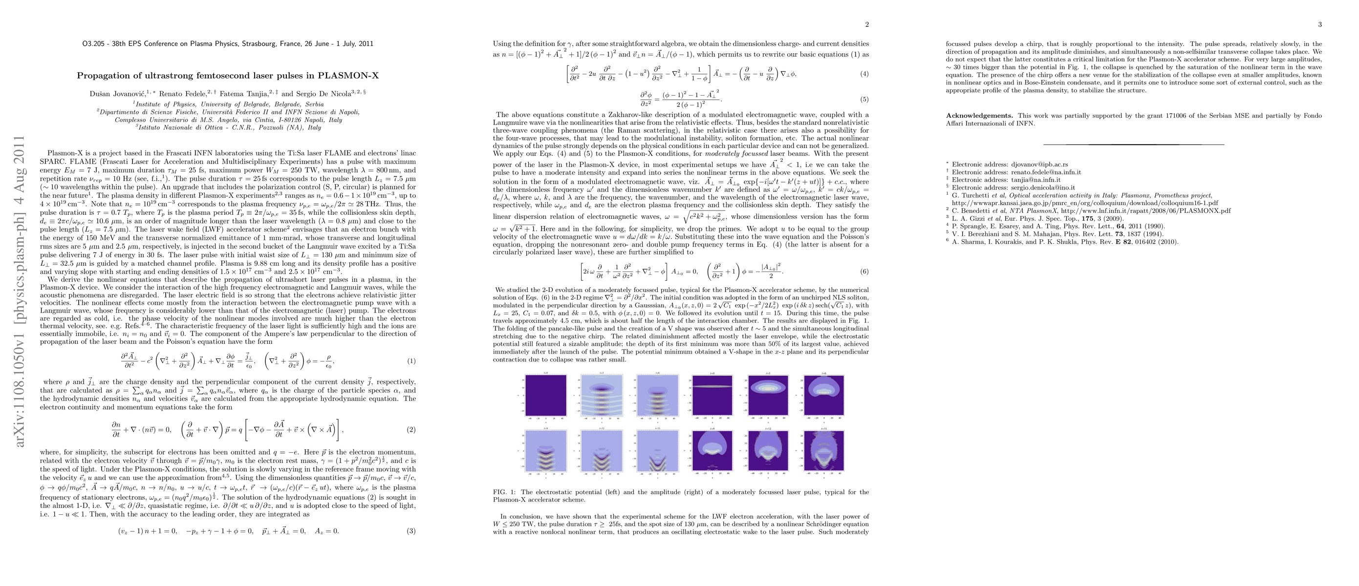 The derivation is presented of the nonlinear equations that describe the propagation of ultrashort laser pulses in a plasma, in the Plasmon-X device. It is shown that the Plasmon-X scheme used for the electron acceleration uses a sufficiently broad beam ($L_\bot\sim 130\,\,\mu{\rm m}$) that justifies the use of the standard stationary 1-D approximation in the electron hydrodynamic equations, since the pulse width is sufficiently bigger than the pulse length ($\sim 7.5\,\,\mu{\rm m}$). Furthermore, with the laser power of $W\leq 250$ TW and the $130\,\,\mu{\rm m}$ spot size, the dimensionless laser vector potential is sufficiently small $|A_{\bot_0}|^2/{2} = ({W}/{c^2\epsilon_0})({\lambda^2}/{8 \pi^2 c})({4}/{\pi L_\bot^2})({e}/{m_0 c})^2 \sim 0.26$, the nonlinearity is sufficiently weak to allow the power expansion in the nonlinear Poissons's equation. Such approximation yields a nonlinear Schr\" odinger equation with a reactive nonlocal nonlinear term. The nonlocality contains a cosine function under the integral, indicating the oscillating wake. For a smaller spot size that is used for the Thomson scattering, $L_\bot = 10\,\, \mu$m, the length and the width of the pulse are comparable, and it is not possible to use the 1-D approximation in the hydrodynamic equations. With such small spot size, the laser intensity is very large, and most likely some sort of chanelling in the plasma would take place (the plasma gets locally depleted so much that the electromagnetic wave practically propagates in vacuum).