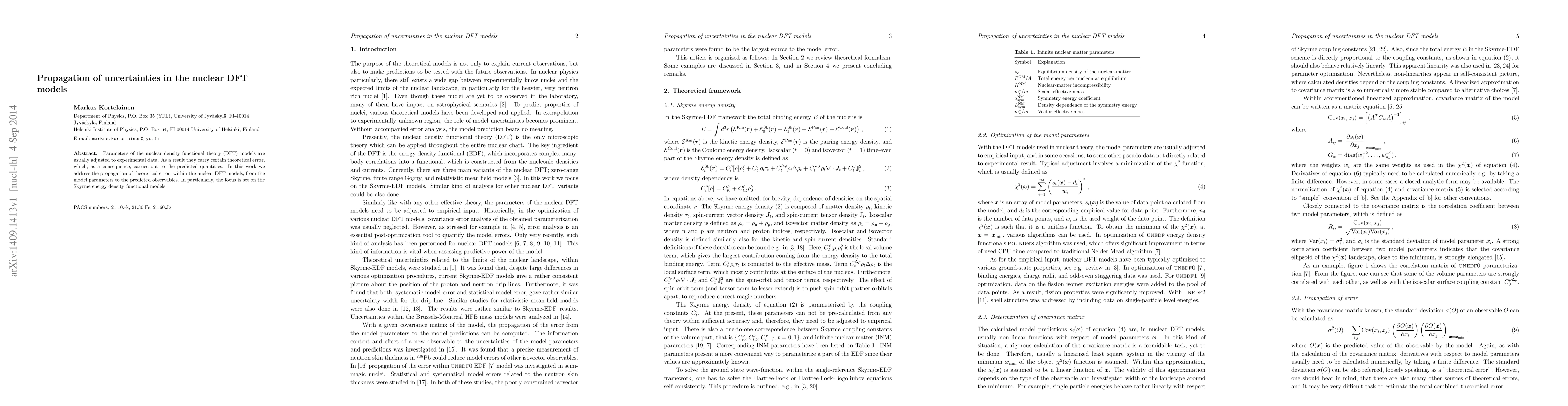 This paper examines error propagation in nuclear DFT models, specifically Skyrme energy density functionals, from adjustable parameters to predicted observables, highlighting the theoretical errors inherent in these models.