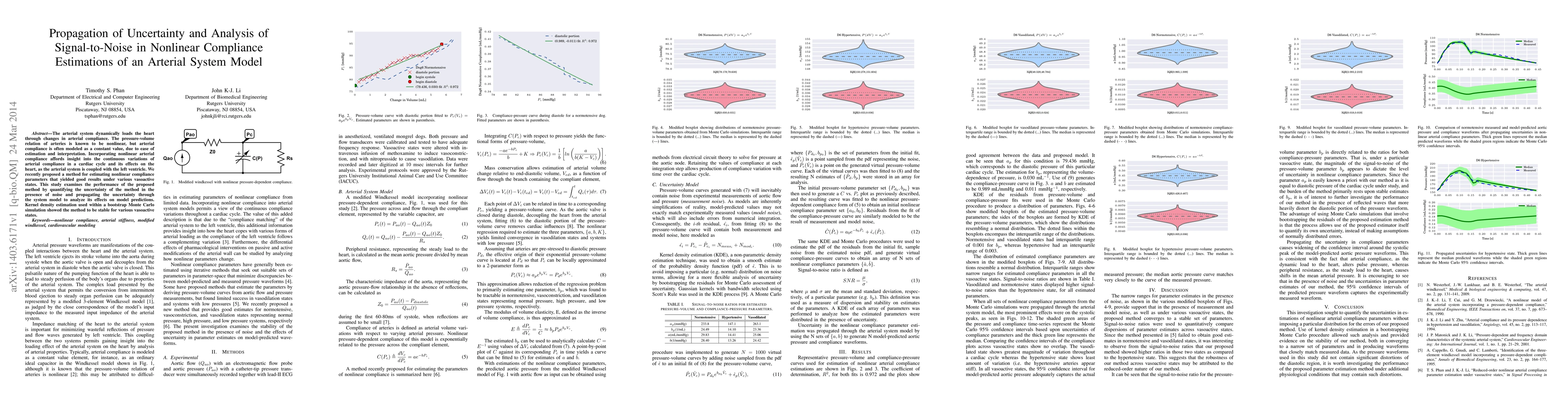The arterial system dynamically loads the heart through changes in arterial compliance. The pressure-volume relation of arteries is known to be nonlinear, but arterial compliance is often modeled as a constant value, due to ease of estimation and interpretation. Incorporating nonlinear arterial compliance affords insight into the continuous variations of arterial compliance in a cardiac cycle and its effects on the heart, as the arterial system is coupled with the left ventricle. We recently proposed a method for estimating nonlinear compliance parameters that yielded good results under various vasoactive states. This study examines the performance of the proposed method by quantifying the uncertainty of the method in the presence of noise and propagating the uncertainty through the system model to analyze its effects on model predictions. Kernel density estimation used within a bootstrap Monte Carlo simulation showed the method to be stable for various vasoactive states.