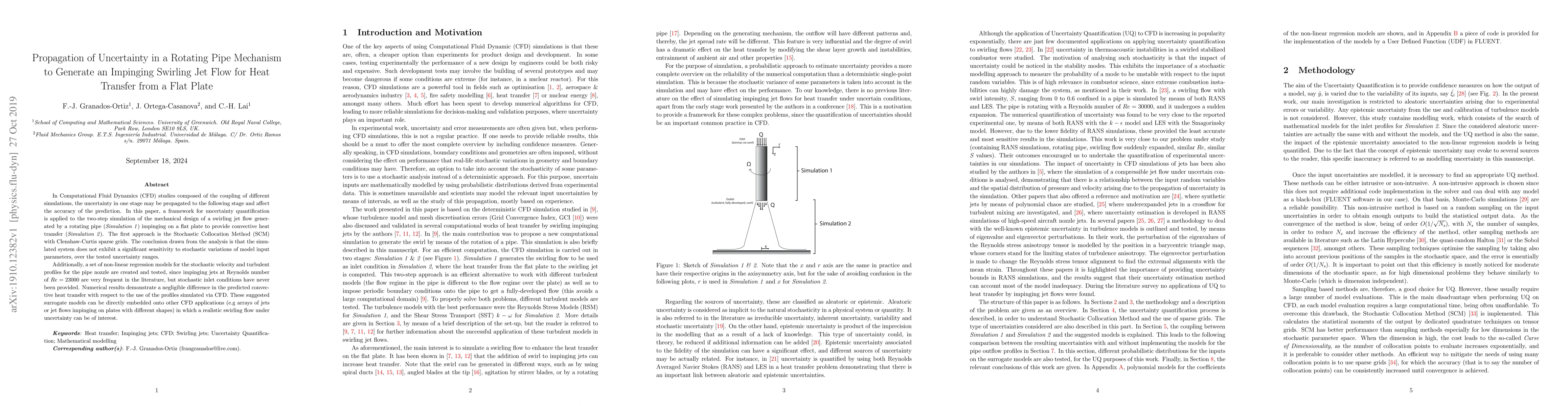 This paper applies a framework for uncertainty quantification to simulate the generation of a swirling jet flow from a rotating pipe mechanism for heat transfer on a flat plate. The Stochastic Collocation Method is used to analyze the propagation of uncertainties in the model parameters, revealing minimal sensitivity to stochastic variations. Additionally, non-linear regression models for stochastic velocity and turbulent profiles are developed and show negligible differences in predicted heat transfer compared to full CFD simulations.