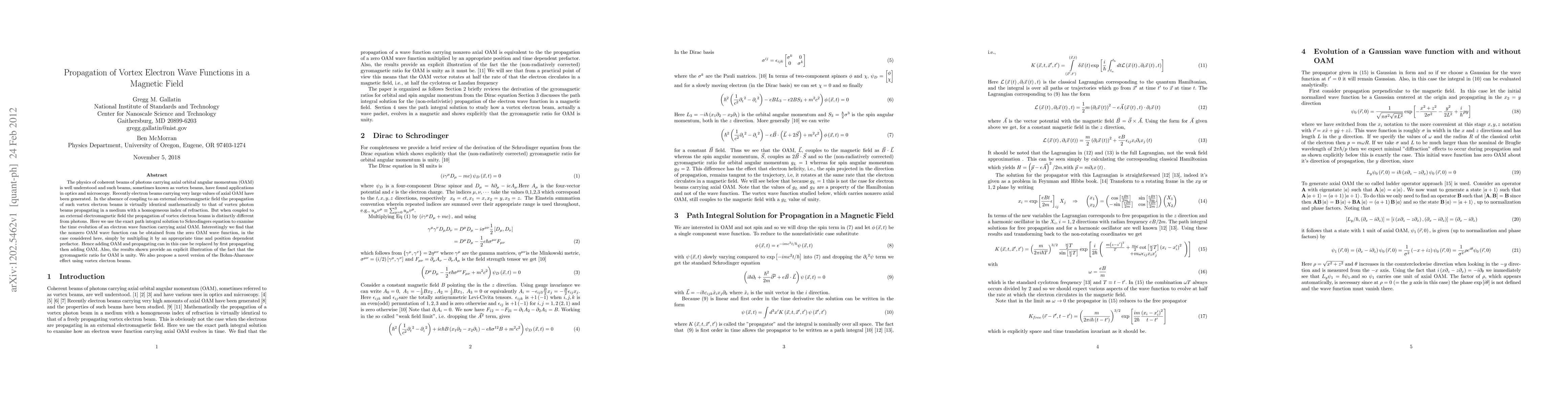 This paper investigates the propagation of vortex electron wave functions in a magnetic field, demonstrating that adding orbital angular momentum (OAM) and propagation can be separated processes. It also proposes a novel Bohm-Aharonov effect using vortex electron beams, highlighting the unity gyromagnetic ratio for OAM.