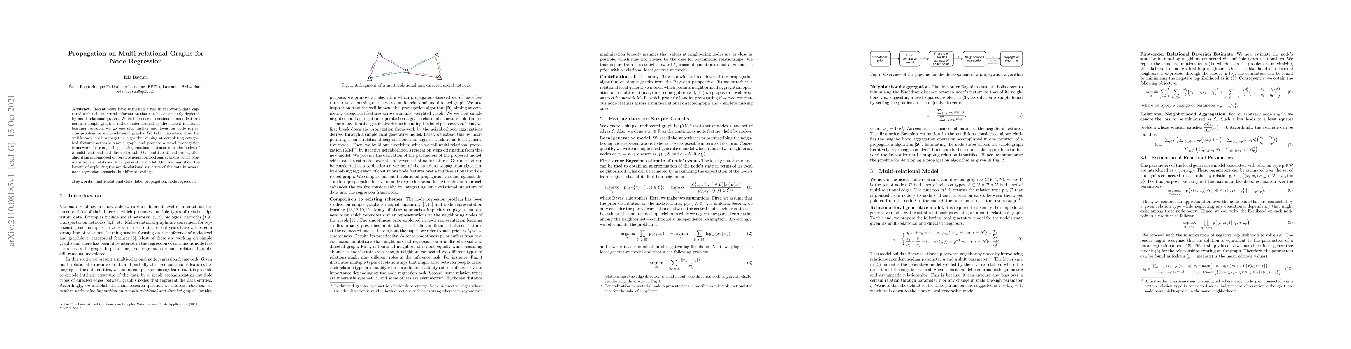 This paper proposes a novel propagation framework for node regression on multi-relational graphs, leveraging iterative neighborhood aggregations based on a relational local generative model. The study demonstrates the advantages of utilizing multi-relational data structures for improving continuous feature prediction across nodes.