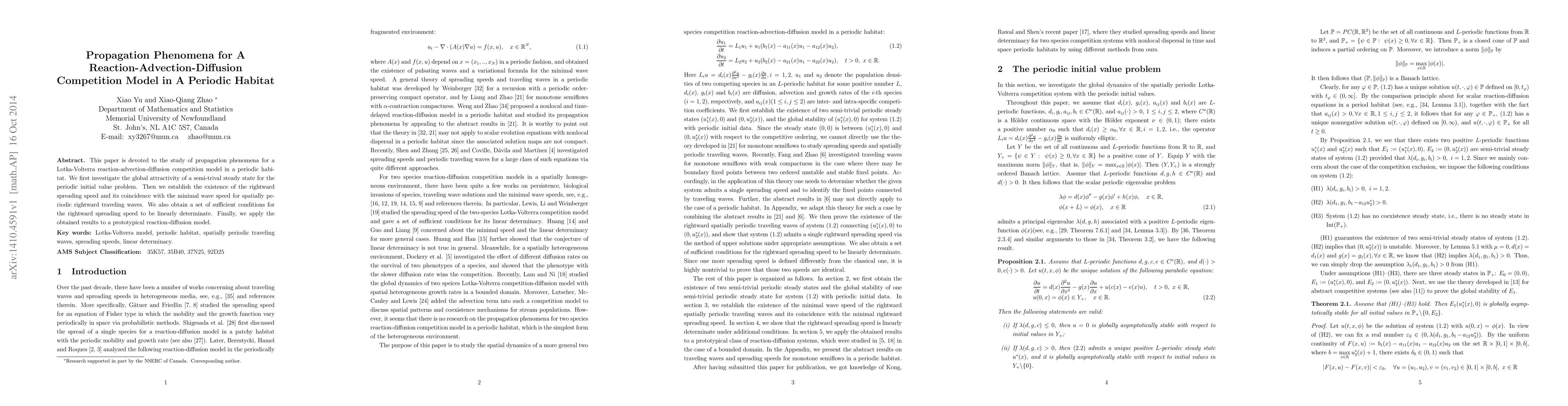 This paper explores the dynamics of a Lotka-Volterra competition model in a periodic habitat, proving the global attractivity of a semi-trivial steady state and establishing the existence of a rightward spreading speed that matches the minimal wave speed for periodic traveling waves. It also provides conditions for the linear determinacy of the spreading speed.