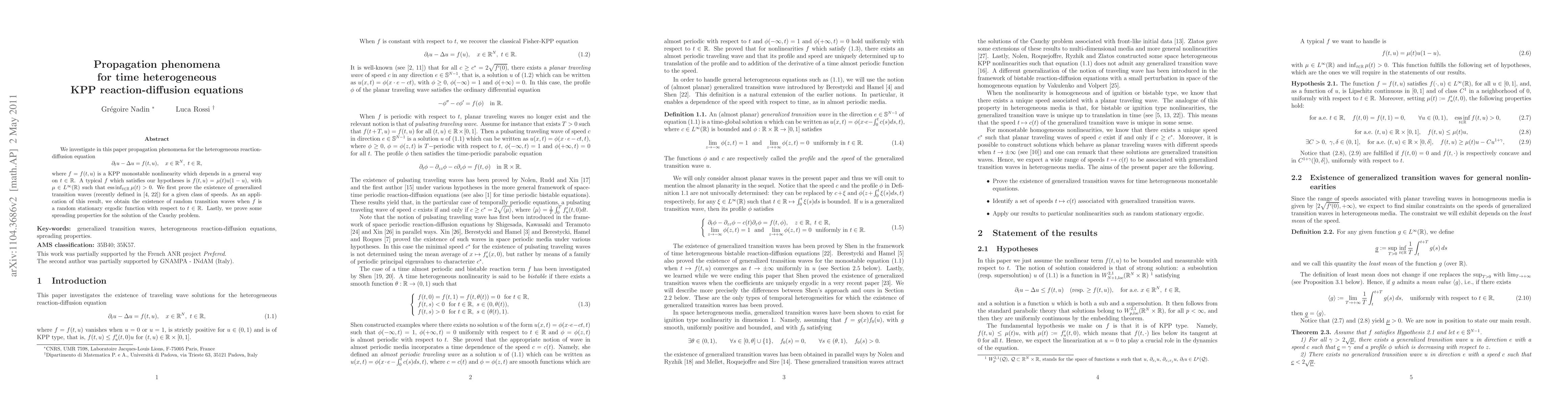 We investigate in this paper propagation phenomena for the heterogeneous reaction-diffusion equation $\partial_t u -\Delta u = f(t,u)$, $x\in R^N$, $t\in\R$, where f=f(t,u) is a KPP monostable nonlinearity which depends in a general way on t. A typical f which satisfies our hypotheses is f(t,u)=m(t) u(1-u), with m bounded and having positive infimum. We first prove the existence of generalized transition waves (recently defined by Berestycki and Hamel, Shen) for a given class of speeds. As an application of this result, we obtain the existence of random transition waves when f is a random stationary ergodic function with respect to t. Lastly, we prove some spreading properties for the solution of the Cauchy problem.