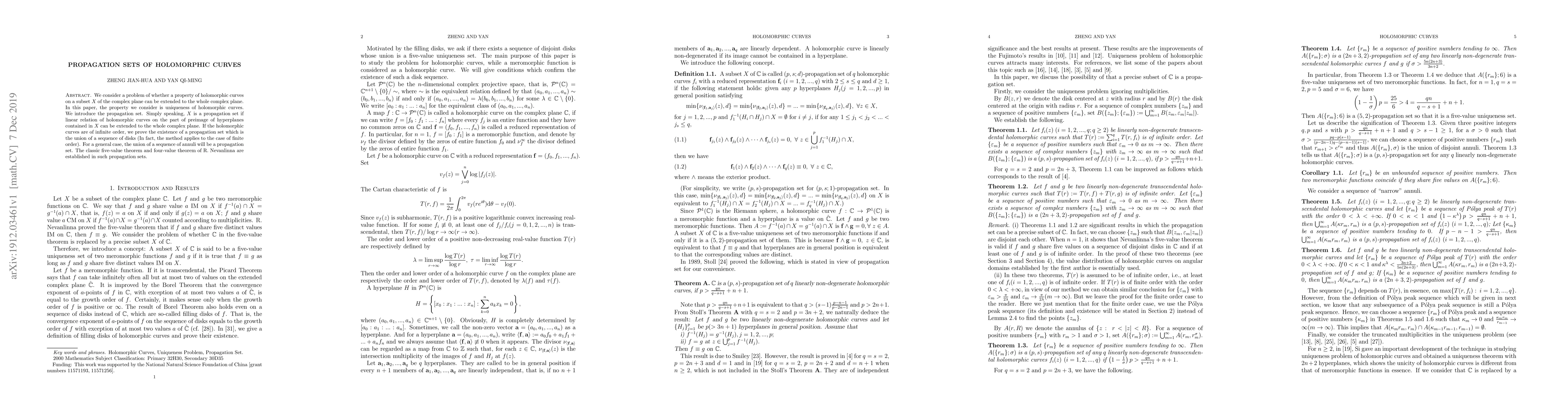 We consider a problem of whether a property of holomorphic curves on a subset $X$ of the complex plane can be extended to the whole complex plane. In this paper, the property we consider is uniqueness of holomorphic curves. We introduce the propagation set. Simply speaking, $X$ is a propagation set if linear relation of holomorphic curves on the part of preimage of hyperplanes contained in $X$ can be extended to the whole complex plane. If the holomorphic curves are of infinite order, we prove the existence of a propagation set which is the union of a sequence of disks (In fact, the method applies to the case of finite order). For a general case, the union of a sequence of annuli will be a propagation set. The classic five-value theorem and four-value theorem of R. Nevanlinna are established in such propagation sets.