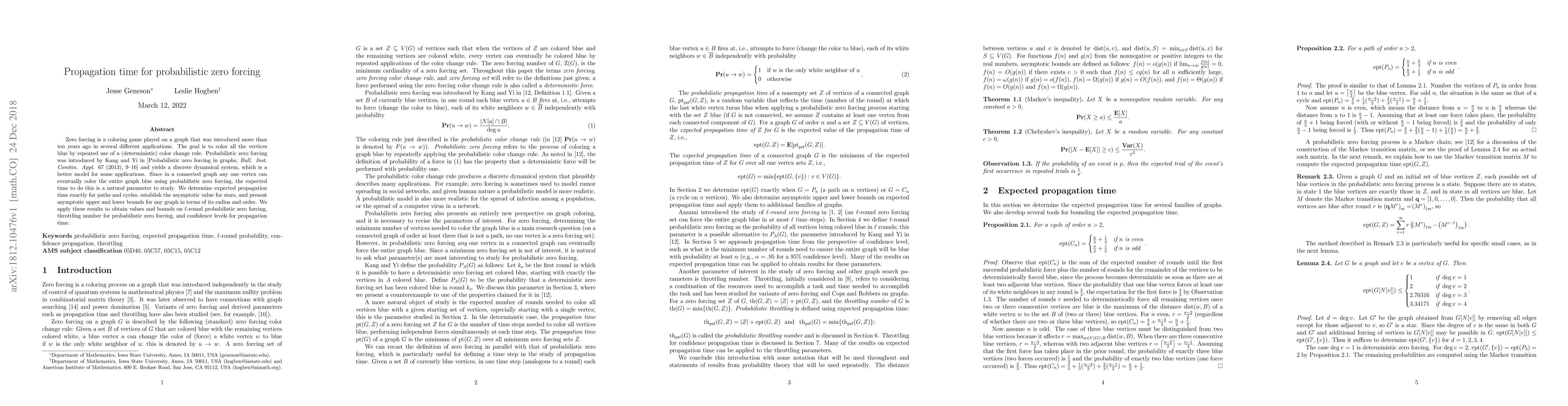 This paper studies the expected time for probabilistic zero forcing to color all vertices in a graph blue, determining exact values for paths and cycles, asymptotic values for stars, and bounds for general graphs based on their radius and order. It also explores applications to $\ell$-round probabilistic zero forcing, throttling number, and confidence levels for propagation time.