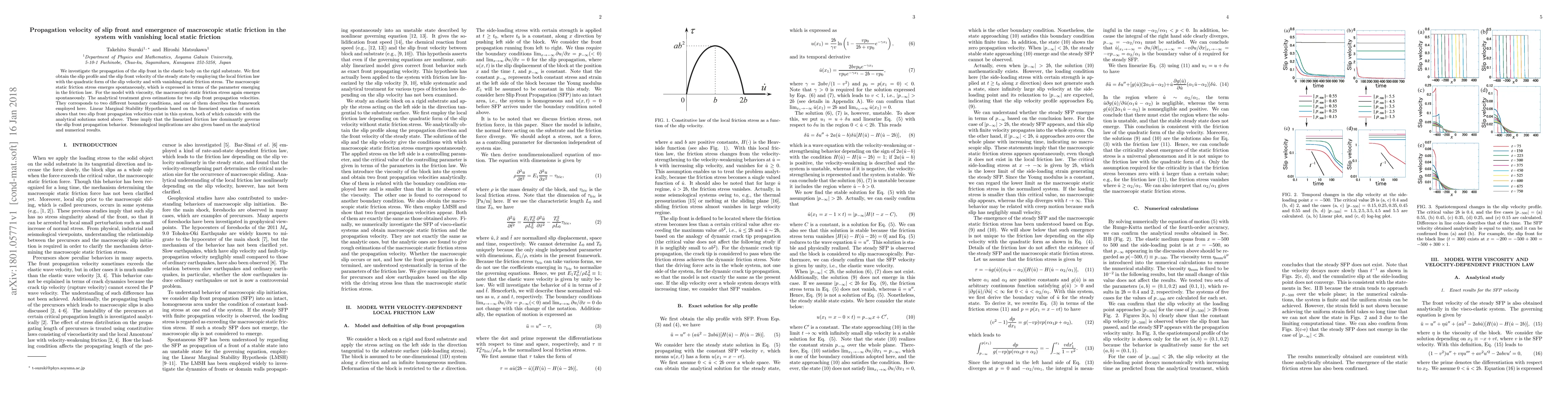 We investigate the propagation of the slip front in the elastic body on the rigid substrate. We first obtain the slip profile and the slip front velocity of the steady state by employing the local friction law with the quadratic form of the slip velocity and with vanishing static friction stress. The macroscopic static friction stress emerges spontaneously, which is expressed in terms of the parameter emerging in the friction law. For the model with viscosity, the macroscopic static friction stress again emerges spontaneously. The analytical treatment gives estimations for two slip front propagation velocities. They corresponds to two different boundary conditions, and one of them describes the framework employed here. Linear Marginal Stability Hypothesis based on the linearized equation of motion shows that two slip front propagation velocities exist in this system, both of which coincide with the analytical solutions noted above. These imply that the linearized friction law dominantly governs the slip front propagation behavior. Seismological implications are also given based on the analytical and numerical results.