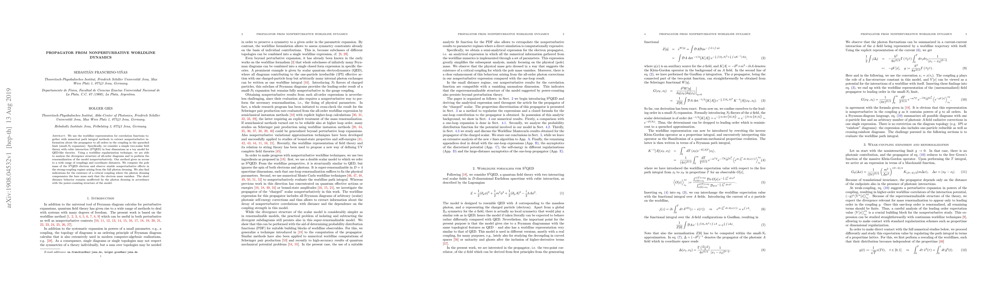 This paper employs worldline dynamics and numerical path integral methods to extract nonperturbative information about the propagator in a simplified two-scalar field theory with cubic interaction. The study reveals significant nonperturbative effects in the strong-coupling regime and suggests a critical coupling where the electron mass vanishes due to photon dressing.