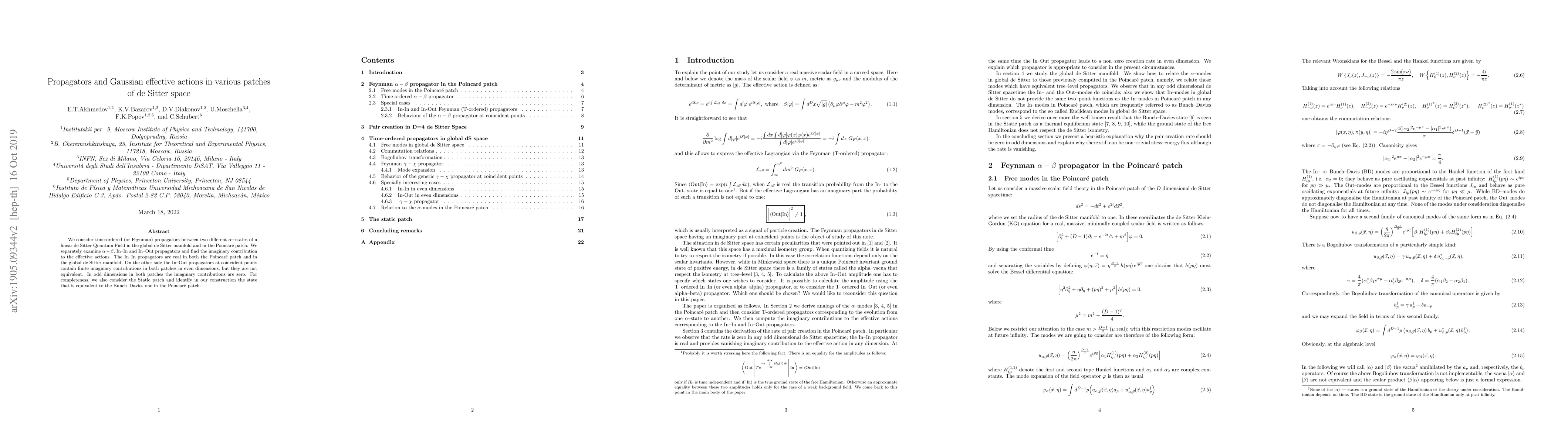 We consider time-ordered (or Feynman) propagators between two different $\alpha-$states of a linear de Sitter Quantum Field in the global de Sitter manifold and in the Poincar\'e patch. We separately examine $\alpha-\beta$, In-In and In-Out propagators and find the imaginary contribution to the effective actions. The In-In propagators are real in both the Poincar\'e patch and in the global de Sitter manifold. On the other side the In-Out propagators at coincident points contain finite imaginary contributions in both patches in even dimensions, but they are not equivalent. In odd dimensions in both patches the imaginary contributions are zero. For completeness, we also consider the Static patch and identify in our construction the state that is equivalent to the Bunch-Davies one in the Poincar\'e patch.