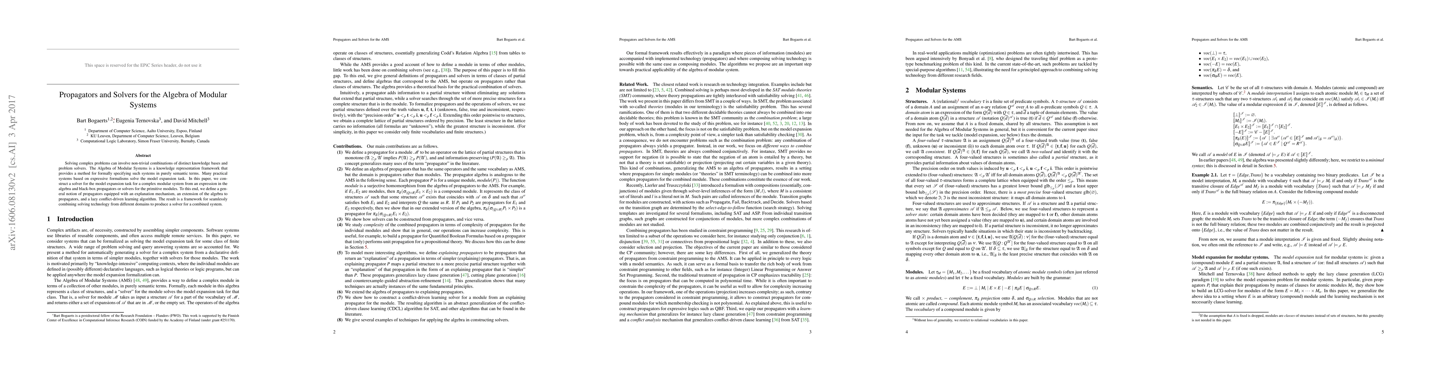 To appear in the proceedings of LPAR 21. Solving complex problems can involve non-trivial combinations of distinct knowledge bases and problem solvers. The Algebra of Modular Systems is a knowledge representation framework that provides a method for formally specifying such systems in purely semantic terms. Formally, an expression of the algebra defines a class of structures. Many expressive formalism used in practice solve the model expansion task, where a structure is given on the input and an expansion of this structure in the defined class of structures is searched (this practice overcomes the common undecidability problem for expressive logics). In this paper, we construct a solver for the model expansion task for a complex modular systems from an expression in the algebra and black-box propagators or solvers for the primitive modules. To this end, we define a general notion of propagators equipped with an explanation mechanism, an extension of the alge- bra to propagators, and a lazy conflict-driven learning algorithm. The result is a framework for seamlessly combining solving technology from different domains to produce a solver for a combined system.