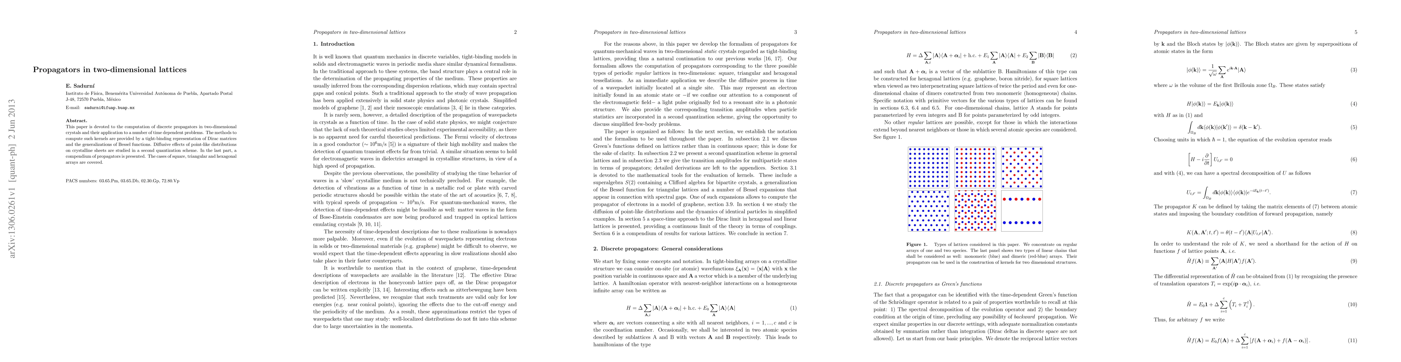 This paper explores the computation of discrete propagators in two-dimensional lattices using tight-binding representations and generalized Bessel functions, and applies these to study diffusive effects in two-dimensional crystals. It concludes with a compendium of propagators for square, triangular, and hexagonal arrays.
