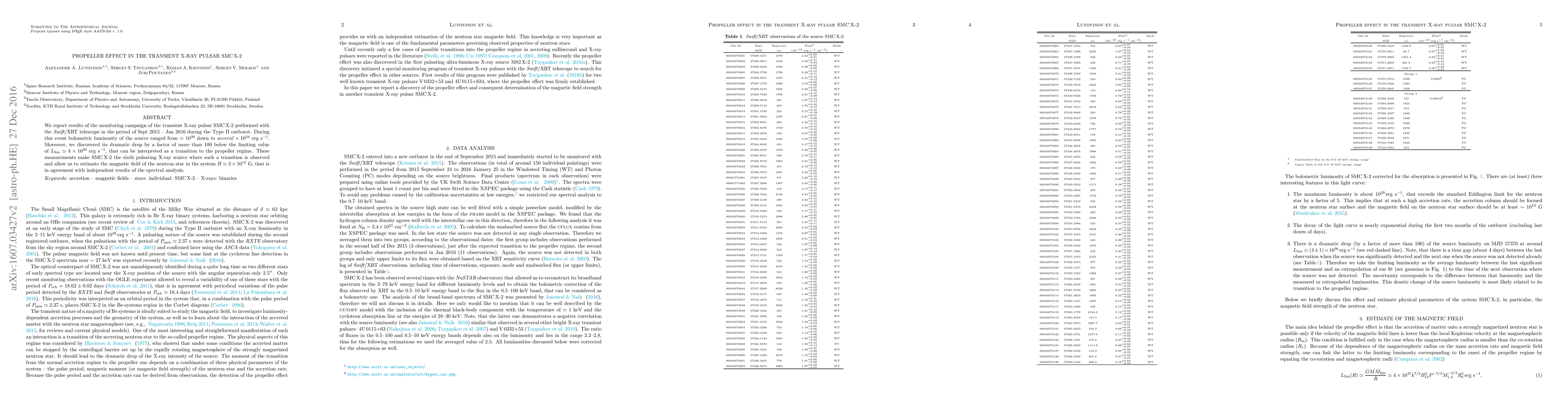 Researchers monitored SMC X-2, a transient X-ray pulsar, for a Type II outburst in 2015-2016, finding its luminosity dropped by over 100 below the limiting value, indicating a transition to the propeller regime. This makes SMC X-2 the sixth pulsating X-ray source where this phenomenon is observed, providing an estimated magnetic field strength of ~3x10^12 G.