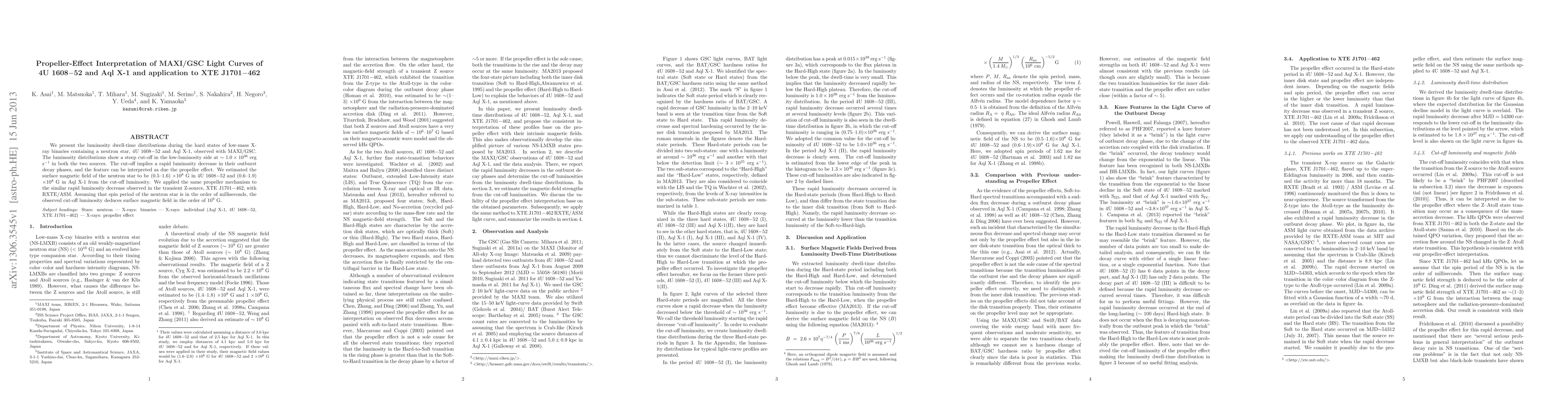 We present the luminosity dwell-time distributions during the hard states of low-mass X-ray binaries containing a neutron star, 4U 1608-52 and AqlX-1, observed with MAXI/GSC. The luminosity distributions show a steep cut-off in the low-luminosity side at $\sim1.0 \times 10^{36}$ erg s$^{-1}$ in both the two sources. The cut-off implies a rapid luminosity decrease in their outburst decay phases, and the feature can be interpreted as due the propeller effect. We estimated the surface magnetic field of the neutron star to be (0.5--1.6) $\times 10^8$ G in 4U 1608-52 and (0.6--1.9) $\times 10^8$ G in AqlX-1 from the cut-off luminosity. We applied the same propeller mechanism to the similar rapid luminosity decrease observed in the transient Z-source, XTE J1701-462, with RXTE/ASM. Assuming that spin period of the neutron star is in the order of milliseconds, the observed cut-off luminosity deduces surface magnetic field in the order of $10^9$ G.