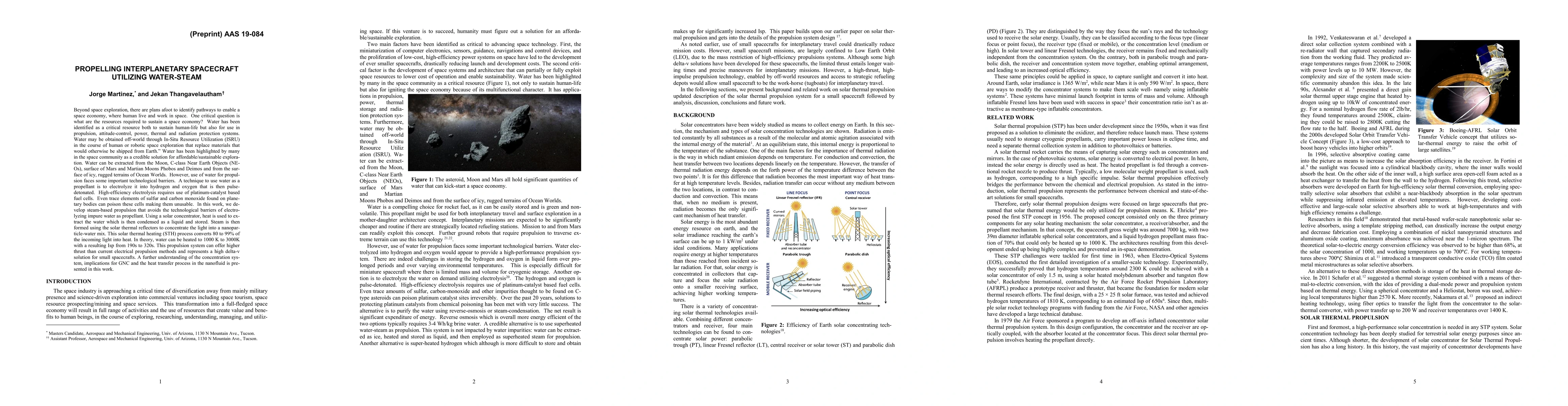 Water has been identified as a critical resource both to sustain human-life but also for use in propulsion, attitude-control, power, thermal and radiation pro-tection systems. Water may be obtained off-world through In-Situ Resource Utilization (ISRU) in the course of human or robotic space exploration that replace materials that would otherwise be shipped from Earth. Water has been highlighted by many in the space community as a credible solution for affordable/sustainable exploration. Water can be extracted from the Moon, C-class Near Earth Objects (NEOs), surface of Mars and Martian Moons Pho-bos and Deimos and from the surface of icy, rugged terrains of Ocean Worlds. However, use of water for propulsion faces some important techno-logical barriers. A technique to use water as a propellant is to electrolyze it into hydrogen and oxygen that is then pulse-detonated. High-efficiency elec-trolysis requires use of platinum-catalyst based fuel cells. Even trace ele-ments of sulfur and carbon monoxide found on planetary bodies can poison these cells making them unusable. In this work, we develop steam-based propulsion that avoids the technological barriers of electrolyzing impure water as propellant. Using a solar concentrator, heat is used to extract the water which is then condensed as a liquid and stored. Steam is then formed using the solar thermal reflectors to concentrate the light into a nanoparticle-water mix. This solar thermal heating (STH) process converts 80 to 99% of the in-coming light into heat.