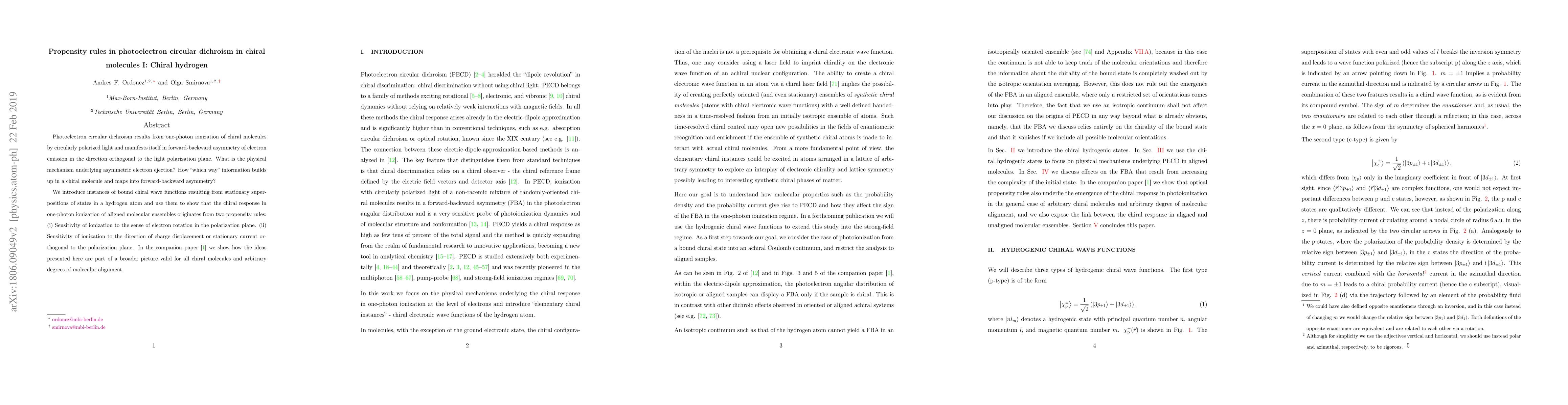 Photoelectron circular dichroism results from one-photon ionization of chiral molecules by circularly polarized light and manifests itself in forward-backward asymmetry of electron emission in the direction orthogonal to the light polarization plane. What is the physical mechanism underlying asymmetric electron ejection? How "which way" information builds up in a chiral molecule and maps into forward-backward asymmetry? We introduce instances of bound chiral wave functions resulting from stationary superpositions of states in a hydrogen atom and use them to show that the chiral response in one-photon ionization of aligned molecular ensembles originates from two propensity rules: (i) Sensitivity of ionization to the sense of electron rotation in the polarization plane. (ii) Sensitivity of ionization to the direction of charge displacement or stationary current orthogonal to the polarization plane. In the companion paper we show how the ideas presented here are part of a broader picture valid for all chiral molecules and arbitrary degrees of molecular alignment.