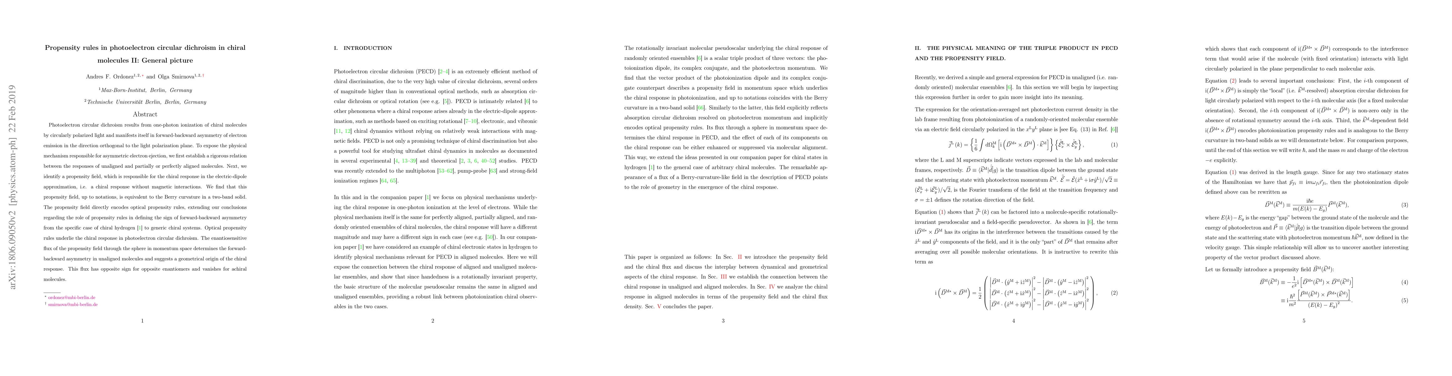 This paper investigates the photoelectron circular dichroism (PECD) phenomenon in chiral molecules, identifying a propensity field responsible for asymmetric electron emission. The study finds that this field is equivalent to the Berry curvature, revealing a geometrical origin for the chiral response and extending optical propensity rules to generic chiral systems.