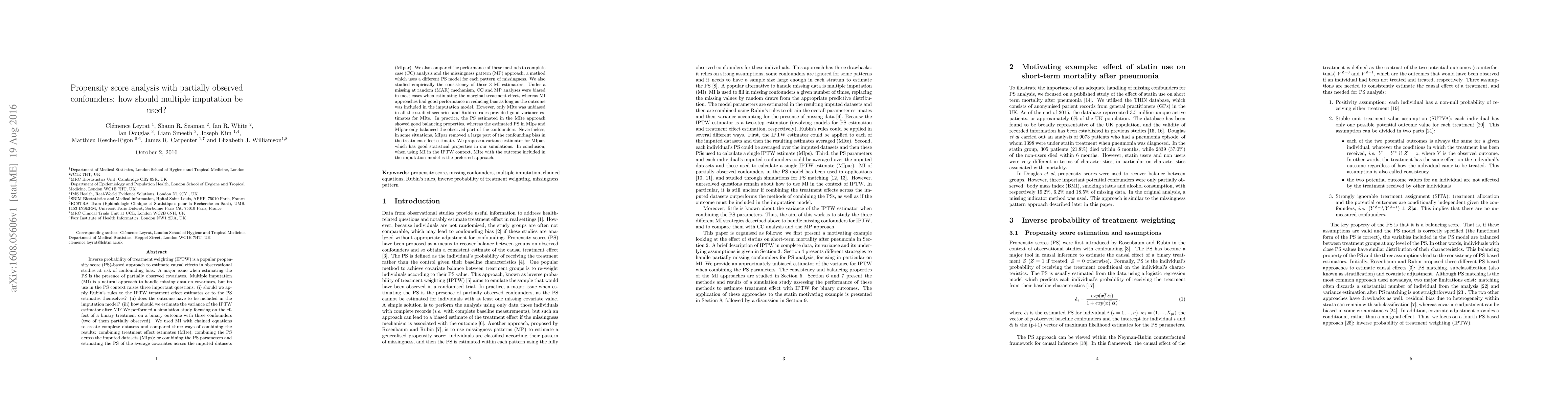 Inverse probability of treatment weighting (IPTW) is a popular propensity score (PS)-based approach to estimate causal effects in observational studies at risk of confounding bias. A major issue when estimating the PS is the presence of partially observed covariates. Multiple imputation (MI) is a natural approach to handle missing data on covariates, but its use in the PS context raises three important questions: (i) should we apply Rubin's rules to the IPTW treatment effect estimates or to the PS estimates themselves? (ii) does the outcome have to be included in the imputation model? (iii) how should we estimate the variance of the IPTW estimator after MI? We performed a simulation study focusing on the effect of a binary treatment on a binary outcome with three confounders (two of them partially observed). We used MI with chained equations to create complete datasets and compared three ways of combining the results: combining treatment effect estimates (MIte); combining the PS across the imputed datasets (MIps); or combining the PS parameters and estimating the PS of the average covariates across the imputed datasets (MIpar). We also compared the performance of these methods to complete case (CC) analysis and the missingness pattern (MP) approach, a method which uses a different PS model for each pattern of missingness. We also studied empirically the consistency of these 3 MI estimators. Under a missing at random (MAR) mechanism, CC and MP analyses were biased in most cases when estimating the marginal treatment effect, whereas MI approaches had good performance in reducing bias as long as the outcome was included in the imputation model. However, only MIte was unbiased in all the studied scenarios and Rubin's rules provided good variance estimates for MIte.