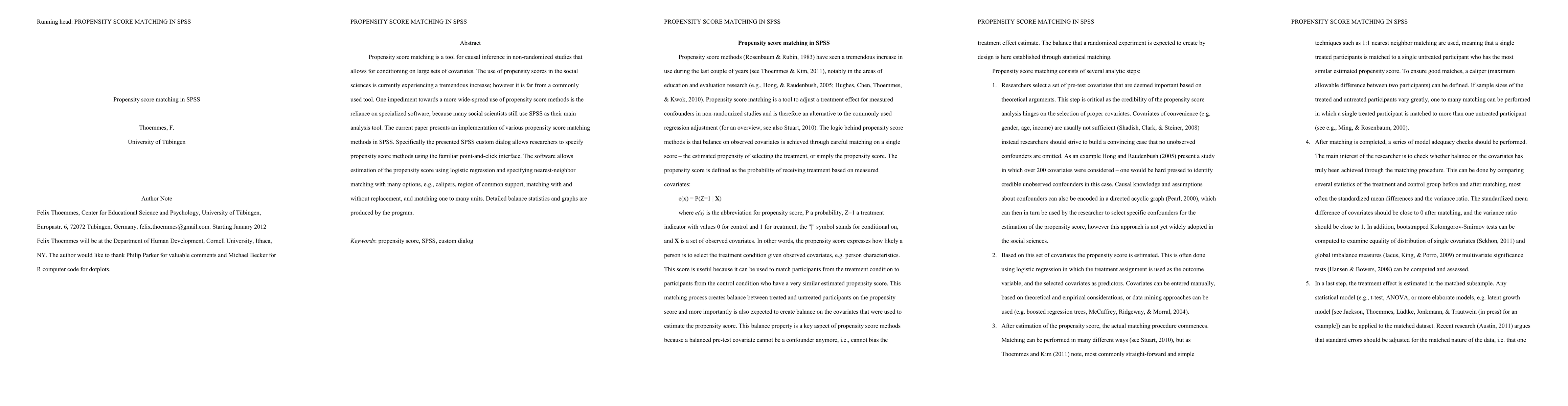 This paper presents a user-friendly implementation of propensity score matching methods in SPSS, enabling researchers to utilize this causal inference tool within their familiar point-and-click interface. The software supports logistic regression for propensity score estimation and various matching options, including detailed balance statistics and graphs.