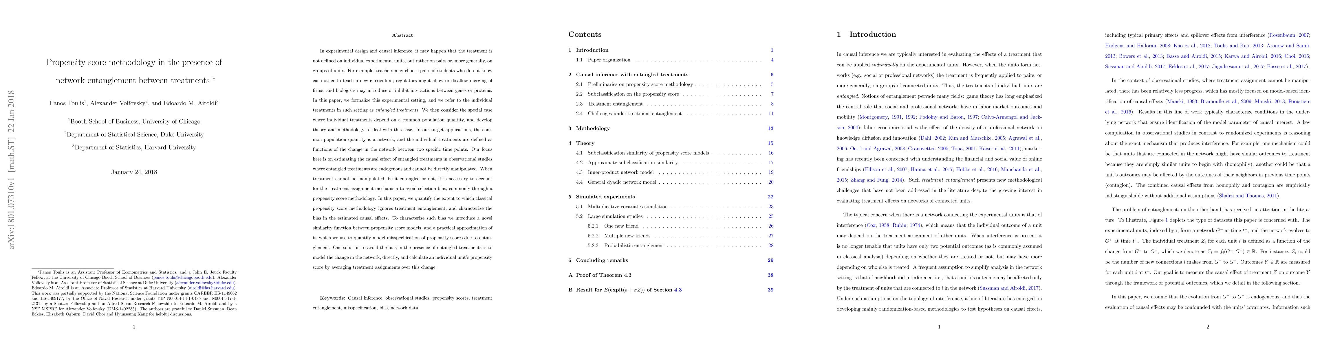 In experimental design and causal inference, it may happen that the treatment is not defined on individual experimental units, but rather on pairs or, more generally, on groups of units. For example, teachers may choose pairs of students who do not know each other to teach a new curriculum; regulators might allow or disallow merging of firms, and biologists may introduce or inhibit interactions between genes or proteins. In this paper, we formalize this experimental setting, and we refer to the individual treatments in such setting as entangled treatments. We then consider the special case where individual treatments depend on a common population quantity, and develop theory and methodology to deal with this case. In our target applications, the common population quantity is a network, and the individual treatments are defined as functions of the change in the network between two specific time points. Our focus is on estimating the causal effect of entangled treatments in observational studies where entangled treatments are endogenous and cannot be directly manipulated. When treatment cannot be manipulated, be it entangled or not, it is necessary to account for the treatment assignment mechanism to avoid selection bias, commonly through a propensity score methodology. In this paper, we quantify the extent to which classical propensity score methodology ignores treatment entanglement, and characterize the bias in the estimated causal effects. To characterize such bias we introduce a novel similarity function between propensity score models, and a practical approximation of it, which we use to quantify model misspecification of propensity scores due to entanglement. One solution to avoid the bias in the presence of entangled treatments is to model the change in the network, directly, and calculate an individual unit's propensity score by averaging treatment assignments over this change.