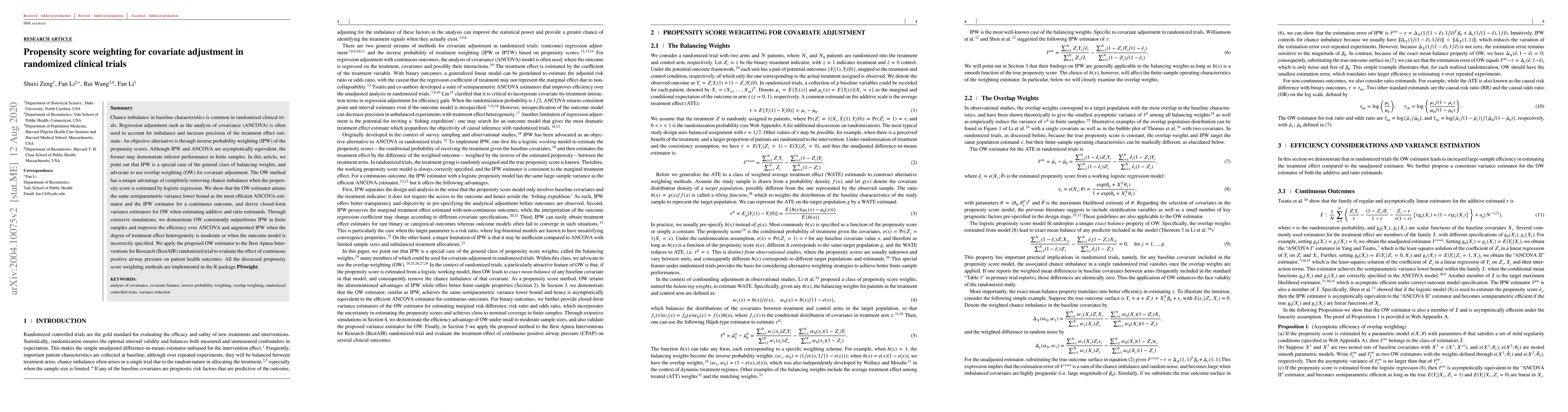 This paper proposes overlap weighting (OW) as a superior alternative to inverse probability weighting (IPW) and analysis of covariance (ANCOVA) for covariate adjustment in randomized clinical trials. OW completely removes chance imbalance and outperforms IPW in finite samples, showing improved efficiency over ANCOVA and augmented IPW under moderate treatment effect heterogeneity or incorrect outcome model specification. The R package PSweight implements all discussed methods.