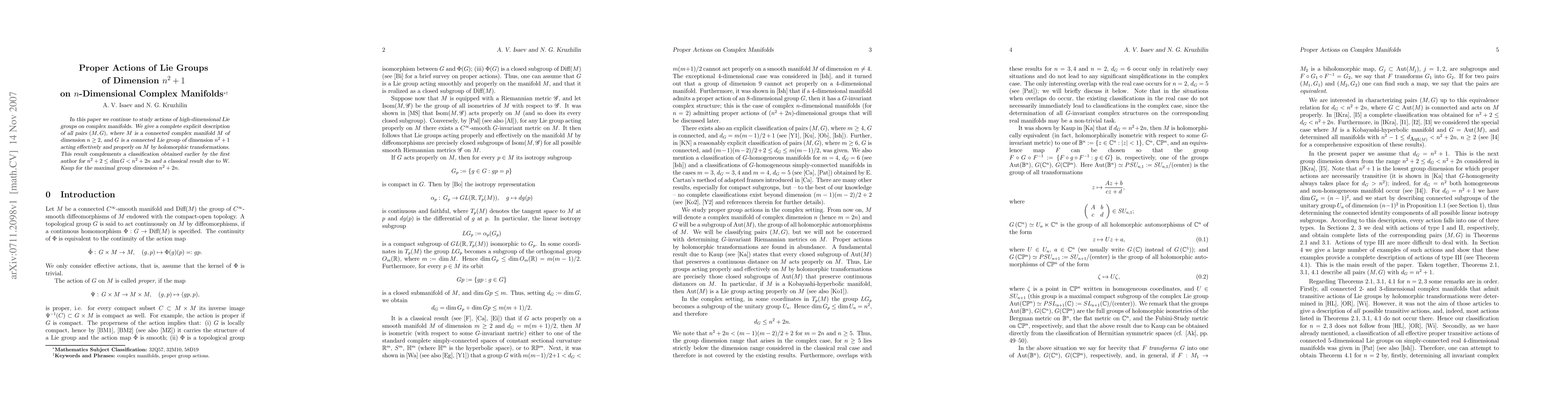 This paper provides an explicit classification of pairs $(M,G)$, where $M$ is an $n$-dimensional complex manifold and $G$ is a $(n^2+1)$-dimensional Lie group acting effectively and properly on $M$. This complements previous classifications for higher-dimensional Lie groups and extends results by W. Kaup on maximal group dimensions.