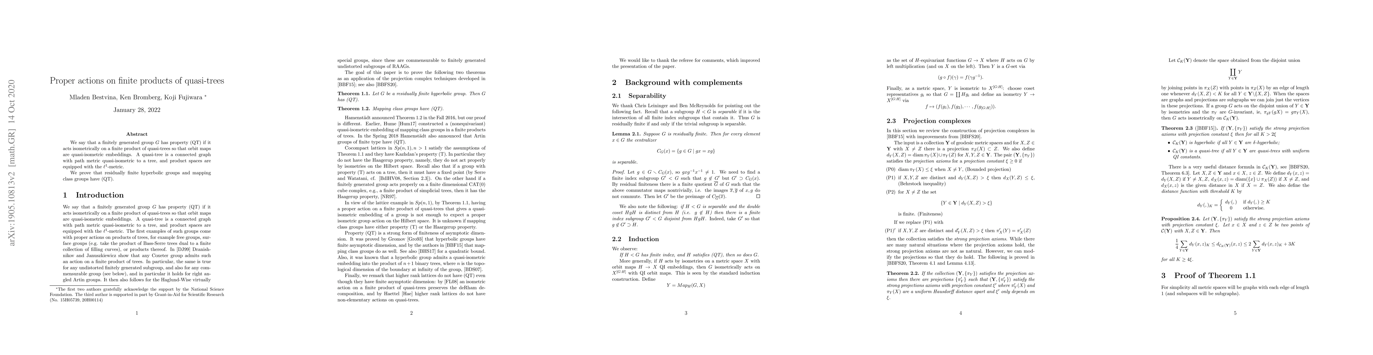 Summary: This paper proves that residually finite hyperbolic groups and mapping class groups possess the property (QT), which involves acting isometrically on finite products of quasi-trees with quasi-isometric embeddings, using projection complex techniques.