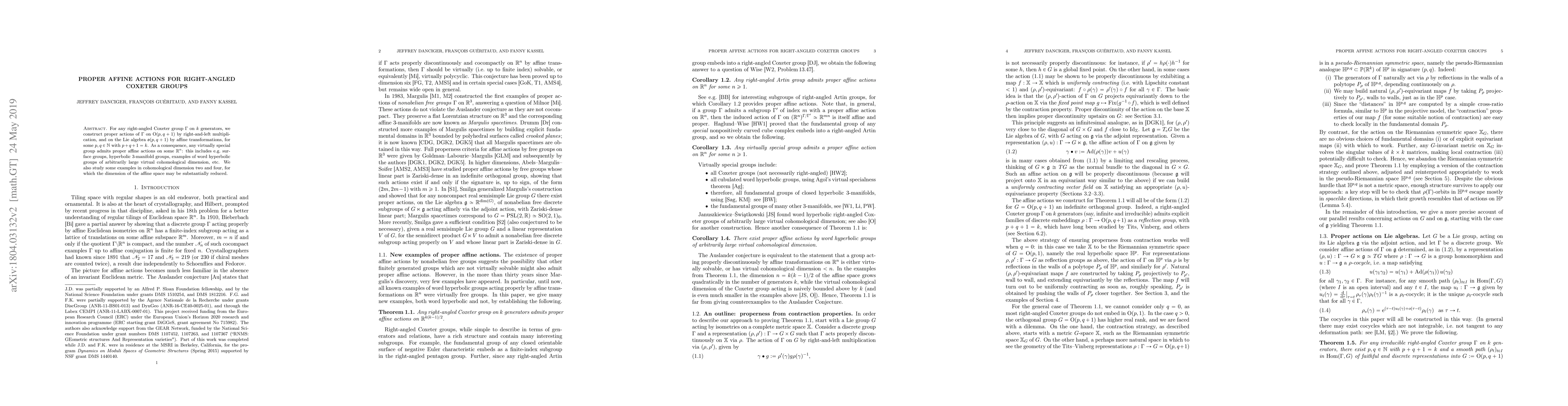 This paper constructs proper affine actions for right-angled Coxeter groups on $\mathrm{O}(p,q+1)$ and $\mathfrak{o}(p,q+1)$, demonstrating that virtually special groups, including surface and hyperbolic 3-manifold groups, admit such actions on $\mathbb R^n$. It also explores reduced dimensions for actions in cohomological dimensions two and four.