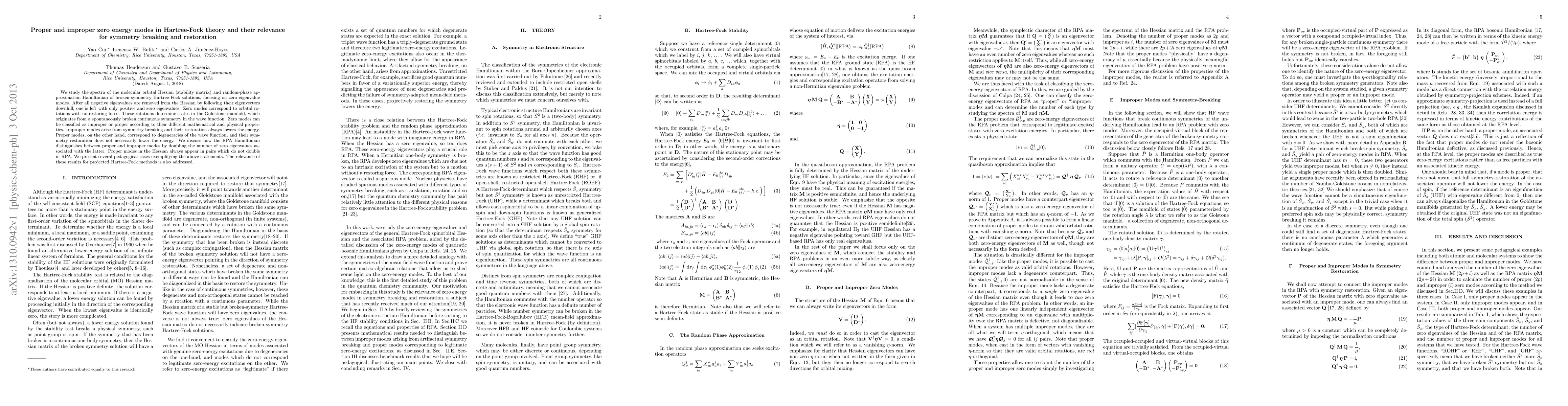 We study the spectra of the molecular orbital Hessian (stability matrix) and random-phase approximation Hamiltonian of broken-symmetry Hartree-Fock solutions, focusing on zero eigenvalue modes. After all negative eigenvalues are removed from the Hessian by following their eigenvectors downhill, one is left with only positive and zero eigenvalues. Zero modes correspond to orbital rotations with no restoring force. These rotations determine states in the Goldstone manifold, which originates from a spontaneously broken continuous symmetry in the wave function. Zero modes can be classified as improper or proper according to their different mathematical and physical properties. Improper modes arise from symmetry breaking and their restoration always lowers the energy. Proper modes, on the other hand, correspond to degeneracies of the wave function, and their symmetry restoration does not necessarily lower the energy. We discuss how the RPA Hamiltonian distinguishes between proper and improper modes by doubling the number of zero eigenvalues associated with the latter. Proper modes in the Hessian always appear in pairs which do not double in RPA. We present several pedagogical cases exemplifying the above statements. The relevance of these results for projected Hartree-Fock methods is also addressed.
